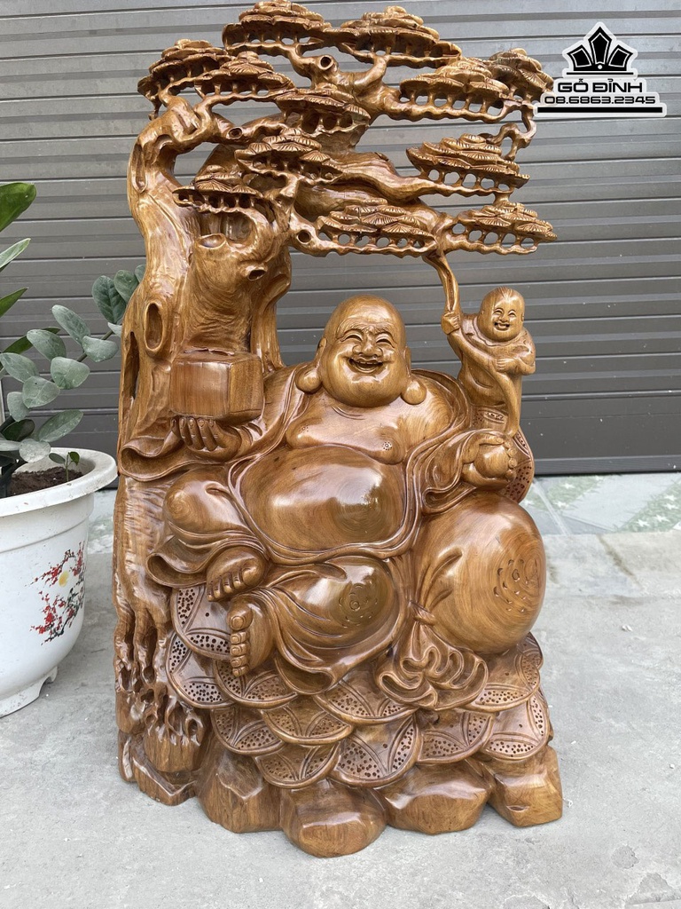 Tượng Phật Di Lặc Ngồi Gốc Tùng Gỗ Bách Xanh Cao 62 Ngang 39 Sâu 22 (cm)