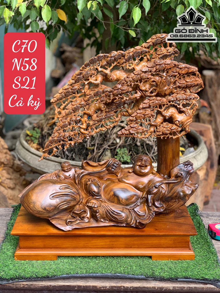 Tượng Phật Di Lặc Ngồi Gốc Tùng Gỗ Bách Xanh Cao 70 Ngang 58 Sâu 21 (cm)