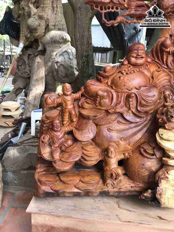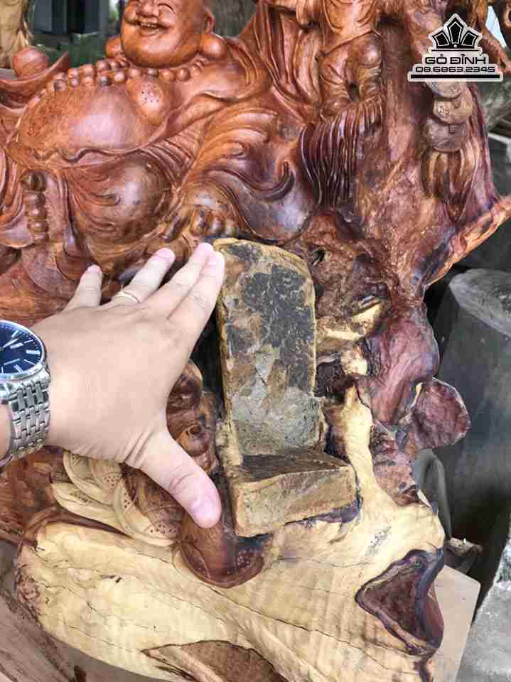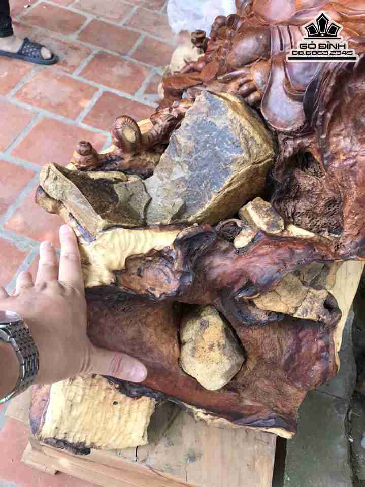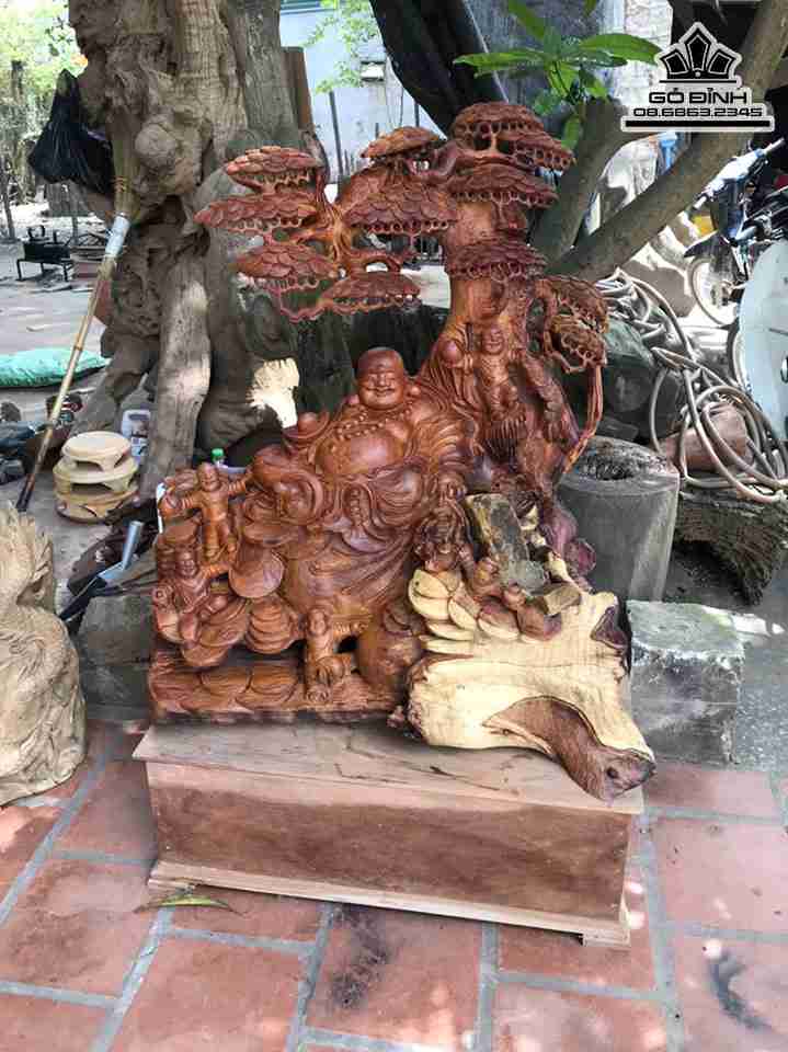 Tượng Phật Di Lặc Ngồi Gốc Tùng Gỗ Hương Cao 94 Ngang 80 Sâu 50 (cm)