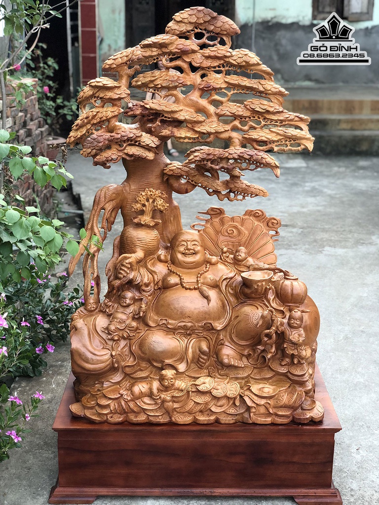 Tượng Phật Di Lặc Ngồi Gốc Tùng Gỗ Hương Cao 128 Ngang 86 Sâu 60 Cả Kỷ 156 (cm)