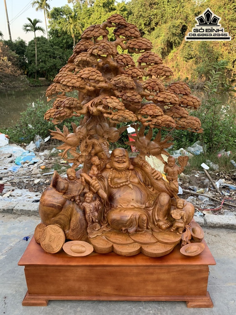 Tượng Phật Di Lặc Ngồi Gốc Tùng Gỗ Hương Cao 160 Ngang 106 Sâu 65 (cm)