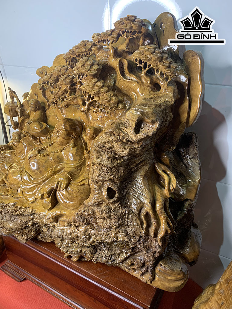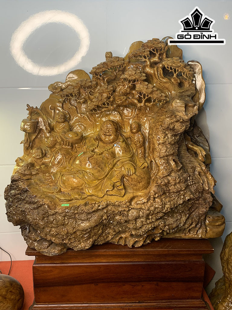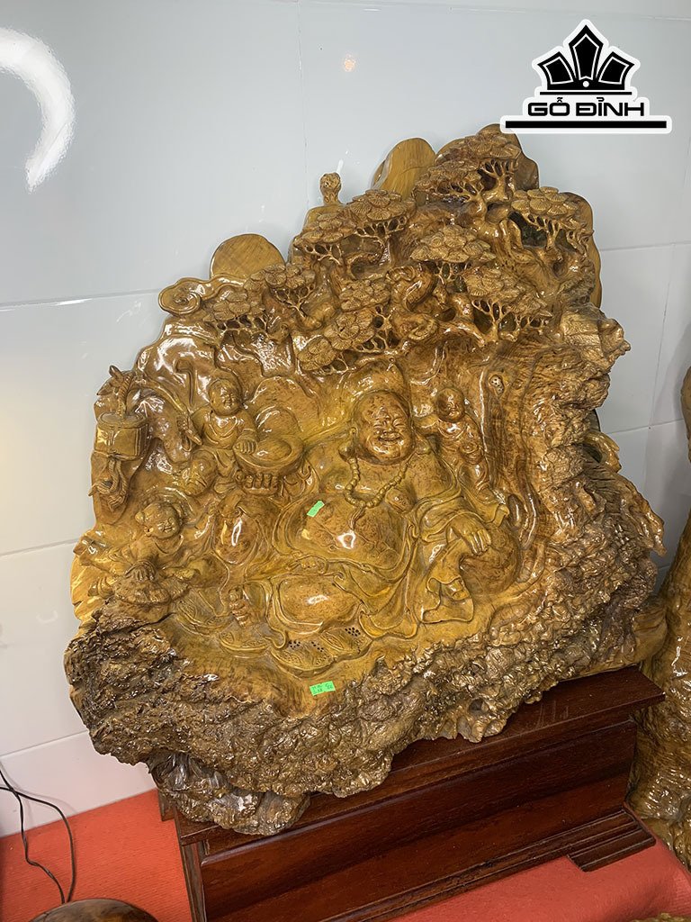 Tượng Phật Di Lặc Ngồi Gốc Tùng Gỗ Nu Kháo Cao 66 Ngang 76 Sâu 38 (cm)