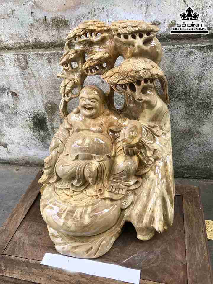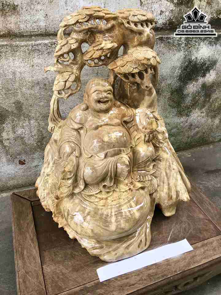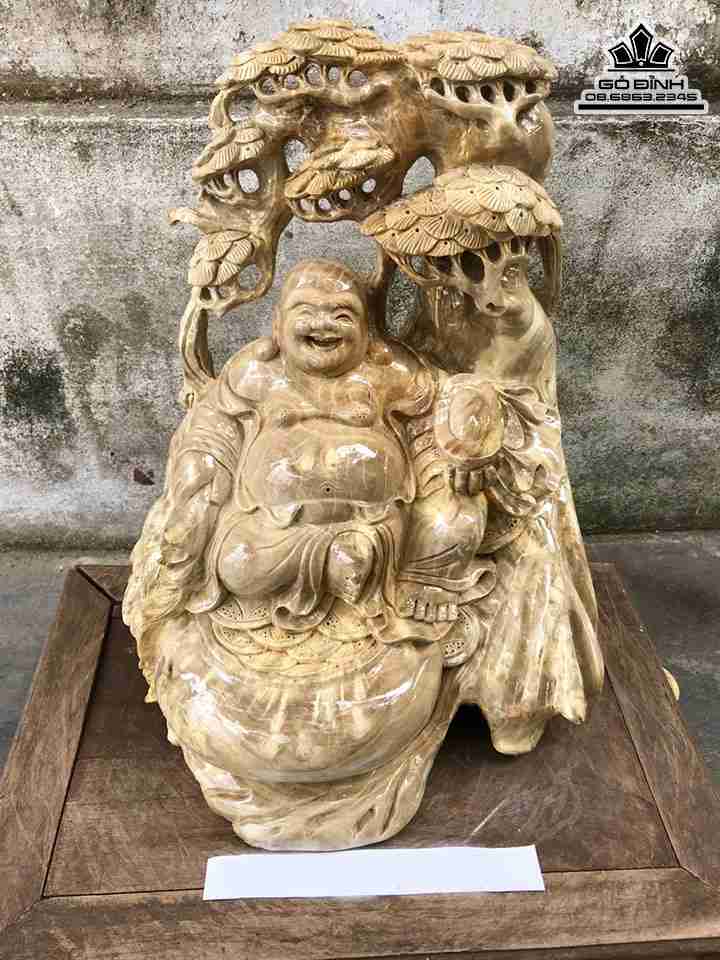 Tượng Phật Di Lặc Ngồi Gốc Tùng Gỗ Nu Nghiến Cao 43 Ngang 36 Sâu 24 (cm)