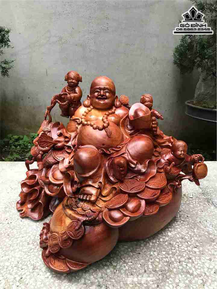 Tượng Phật Di Lặc Ngồi Tam Phúc Gỗ Xá Xị ( Gù Hương ) Cao 43 Ngang 55 Sâu 50 (cm)