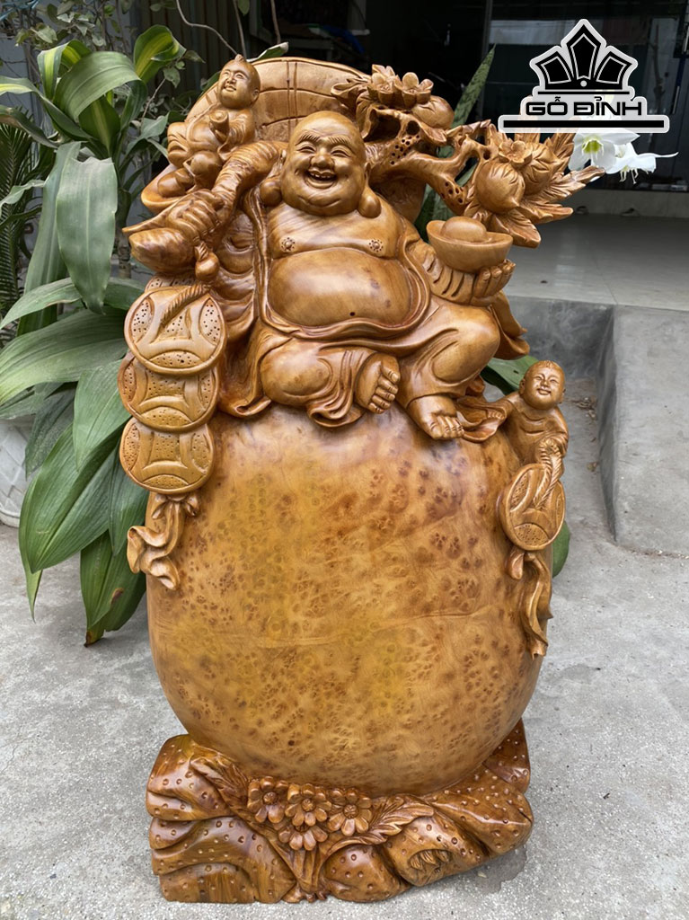 Tượng Phật Di Lặc Ngồi Vác Cành Đào Gỗ Nu Xá Xị Cao 70 Ngang 37 Sâu 16 (cm)
