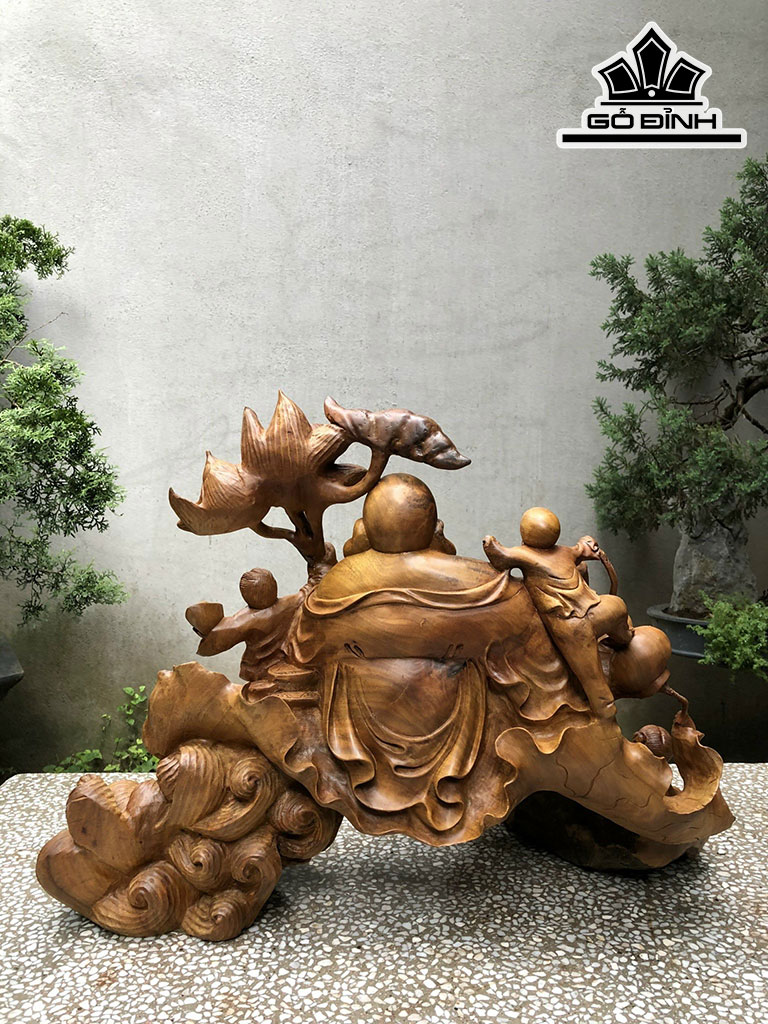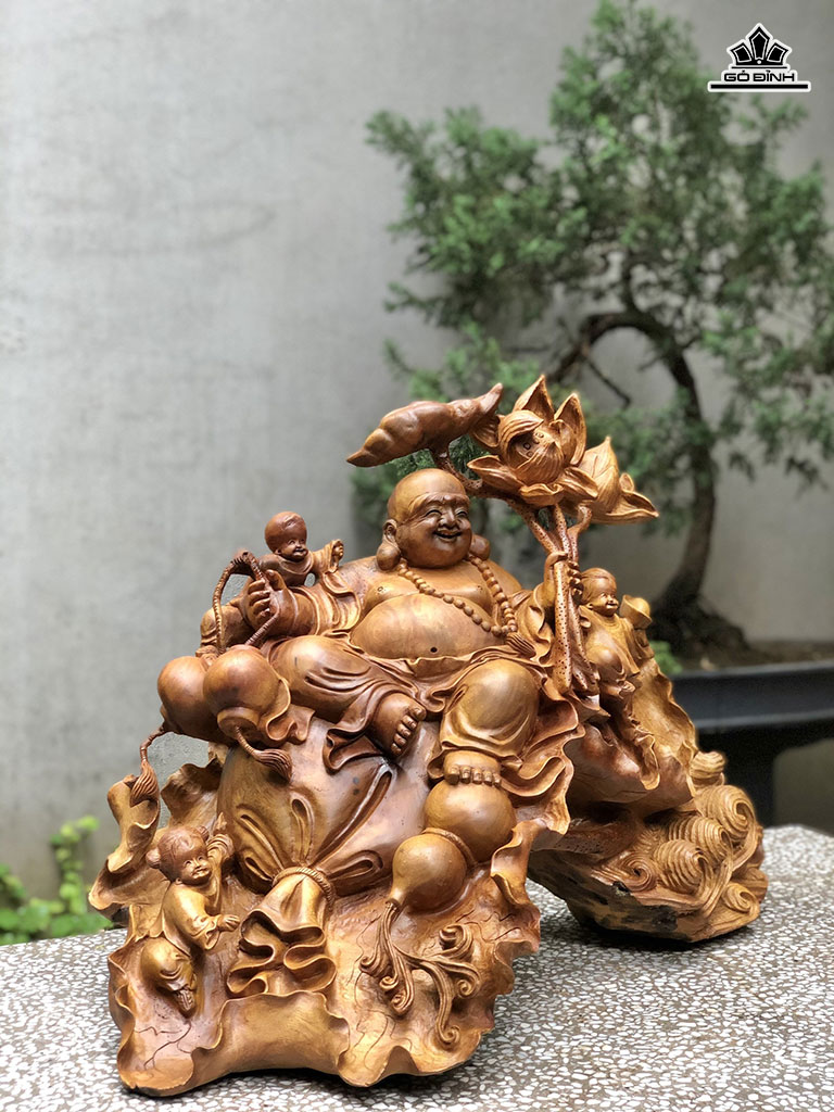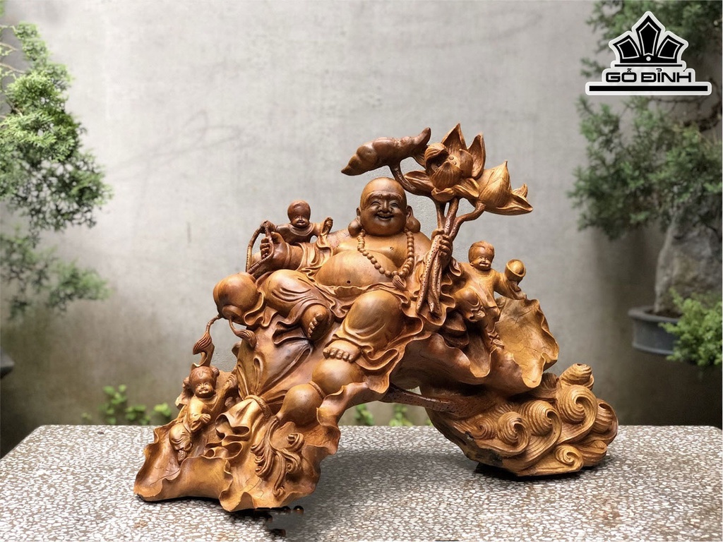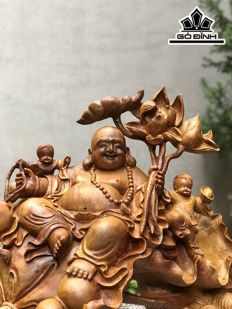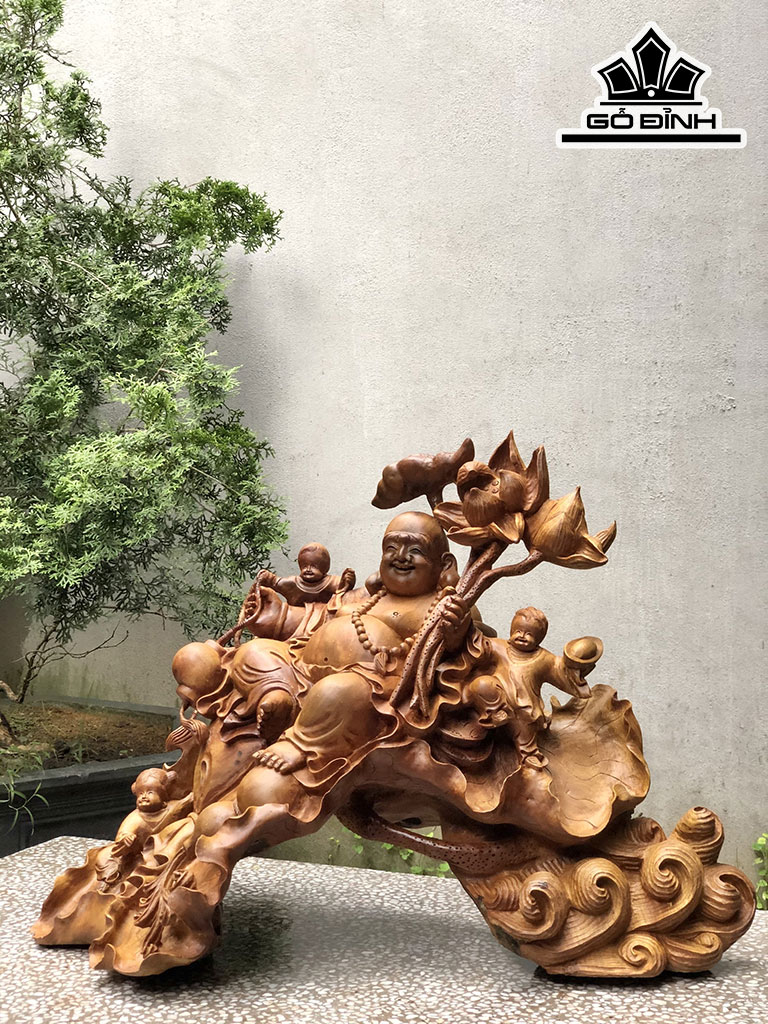 Tượng Phật Di Lặc Ngự Đài Sen Gỗ Xá Xị Cao 55 Ngang 72 Sâu 38 (cm)