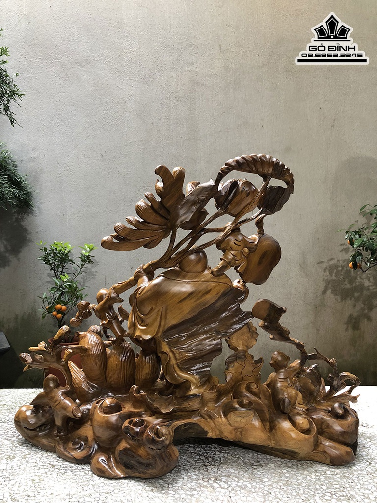 Tượng Phật Di Lặc Ngũ Phúc Đứng Hoa Sen Gỗ Bách Xanh Cao 56 Ngang 73 Sâu 36 (cm)
