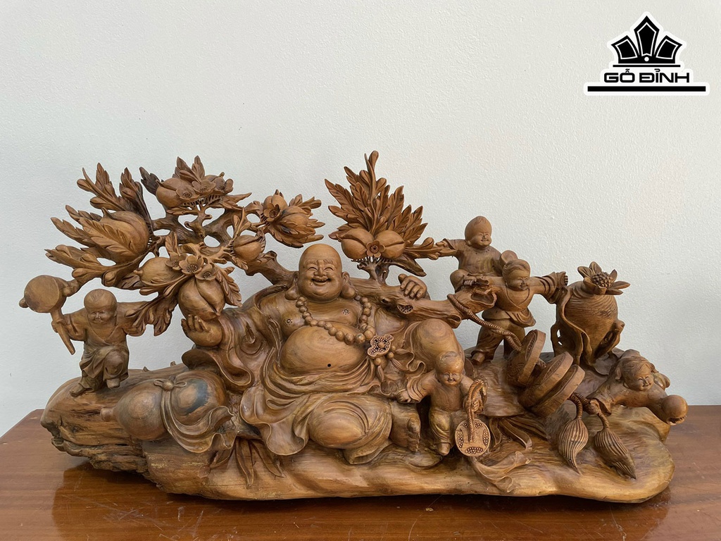 Tượng Phật Di Lặc Ngũ Phúc Gỗ Bách Xanh Cao 38 Ngang 80 Sâu 24 (cm)