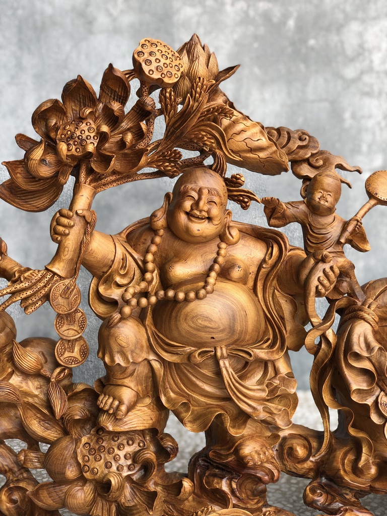 Tượng Phật Di Lặc Ngũ Phúc Gỗ Bách Xanh