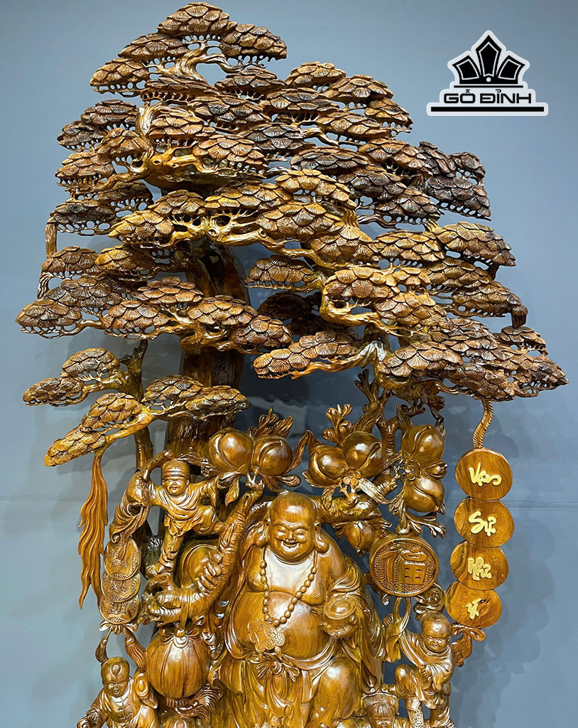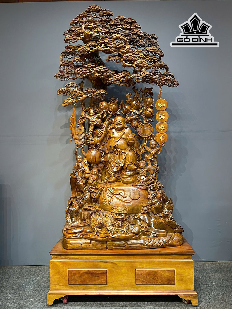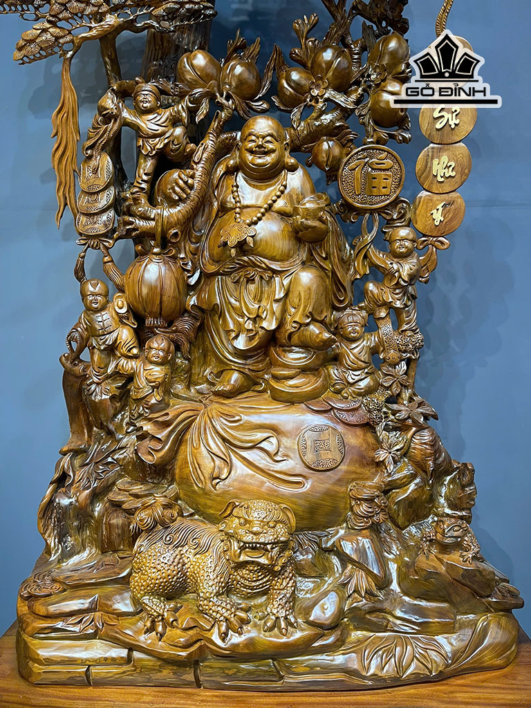 Tượng Phật Di Lặc Ngũ Phúc Gỗ Bách Xanh Cao Cả Kỷ 252 - Riêng Kỷ Cao 40 Ngang 113 Sâu 68 (cm)