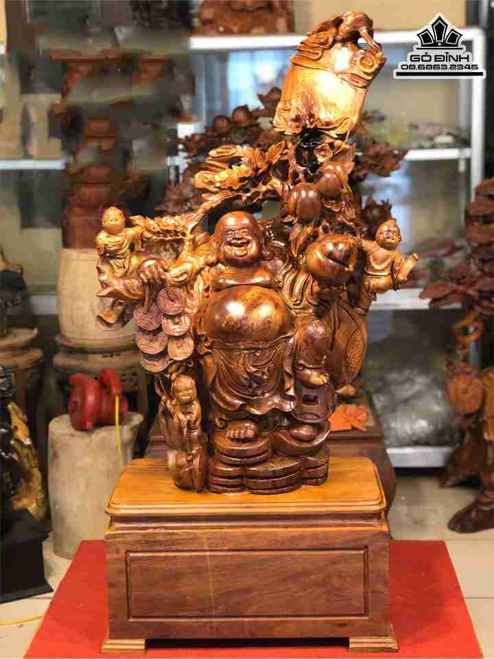 Tượng Phật Di Lặc ngũ phúc gỗ hương cao 1m10 (kỉ cao 27cm) rộng 55 sâu 25 (cm)