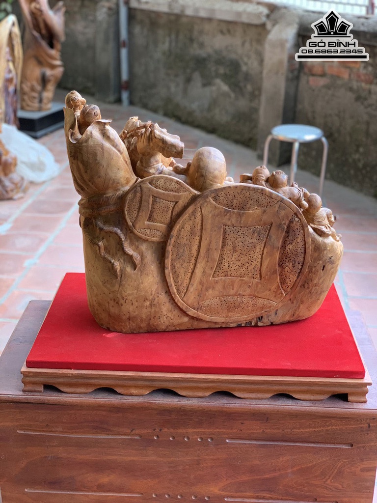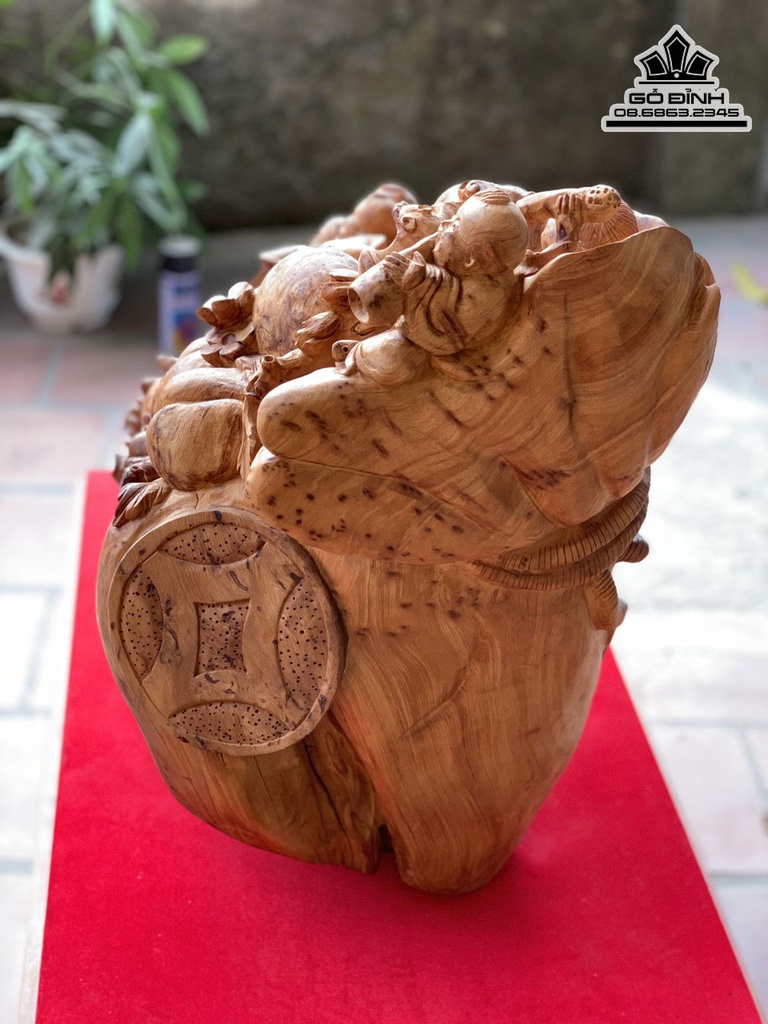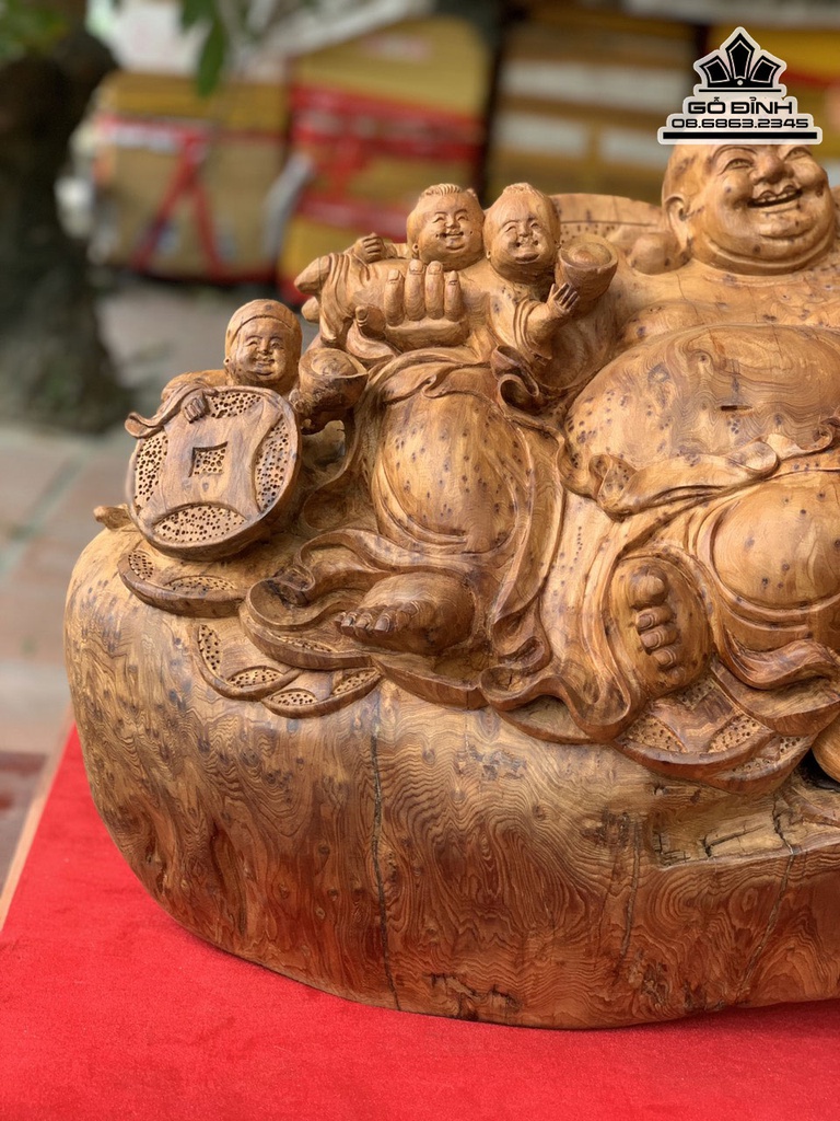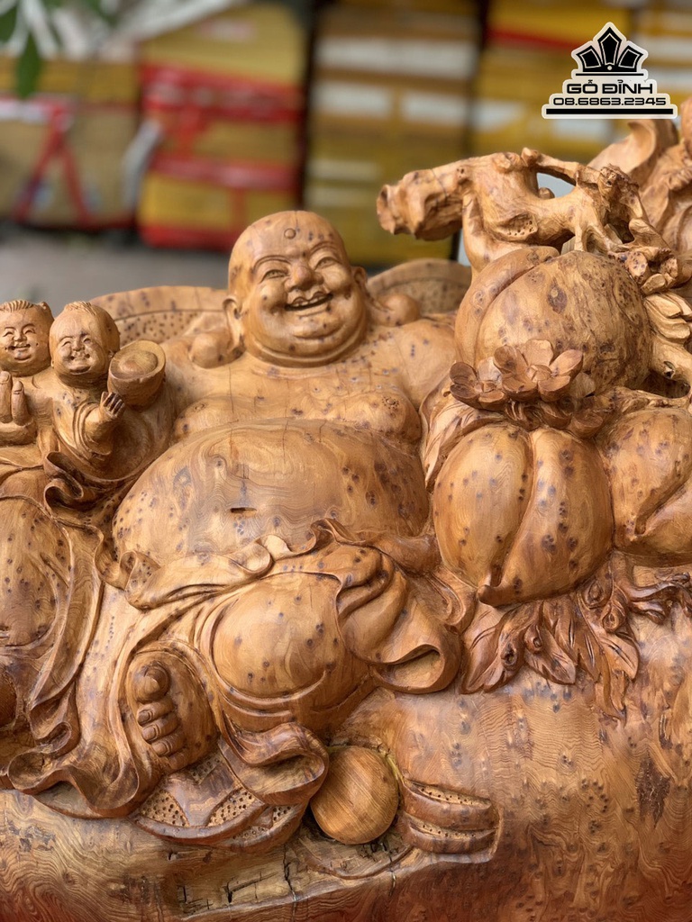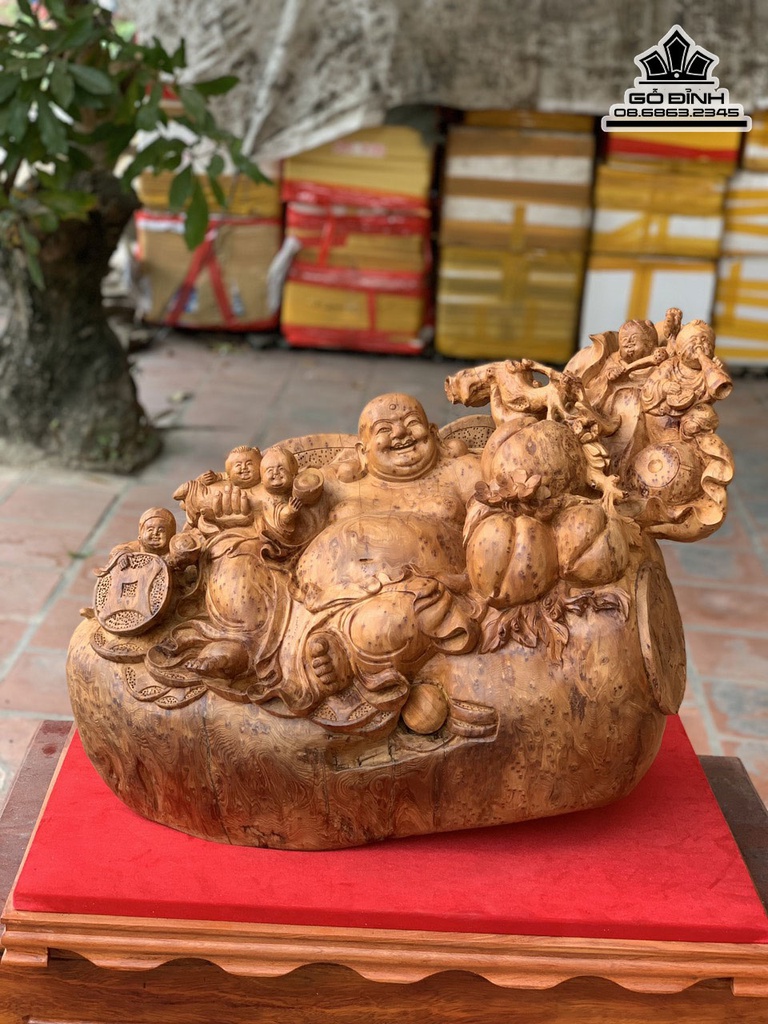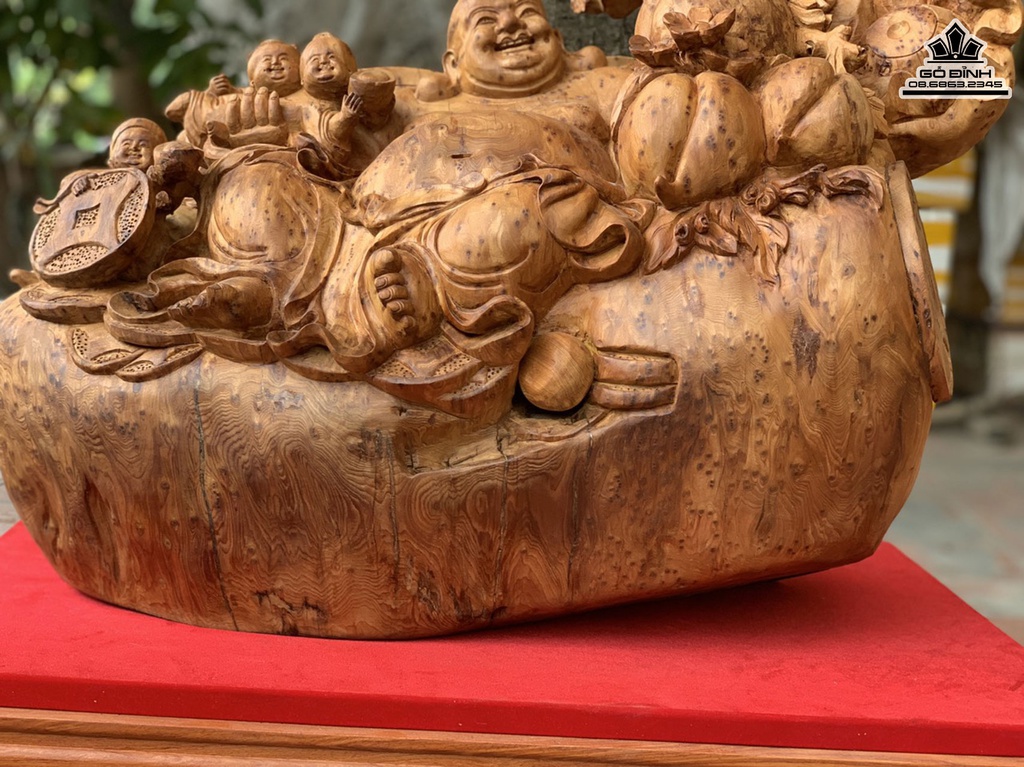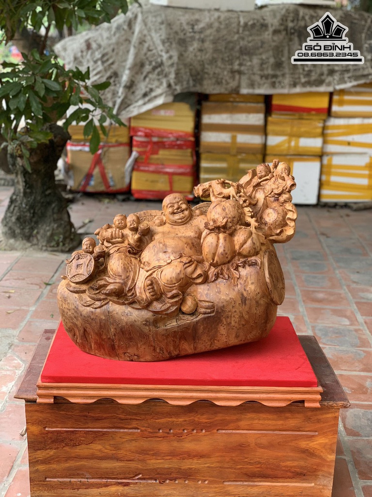 Tượng Phật Di Lặc Ngũ Phúc Gỗ Nu Ngọc Am Cao 55 Ngang 68 Sâu 38 Cả Kỷ 63.5 (cm)