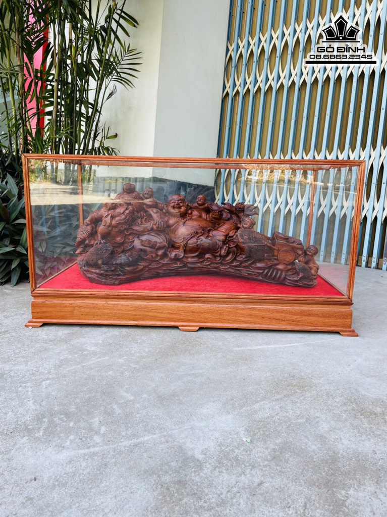 Tượng Phật Di Lặc Ngũ Phúc Gỗ Sưa Cao 30 Ngang 76 Sâu 35 Cả Tủ 50 (cm)