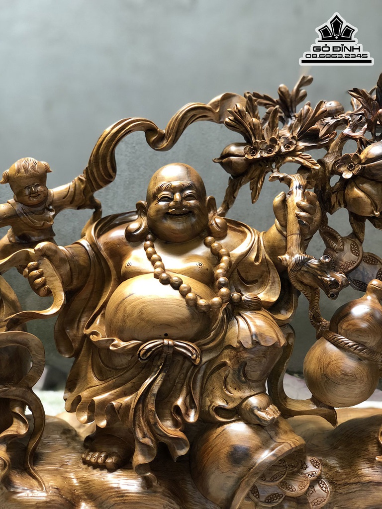 Tượng Phật Di Lặc Ngũ Phúc kéo Bao Tiền Gỗ Bách Xanh