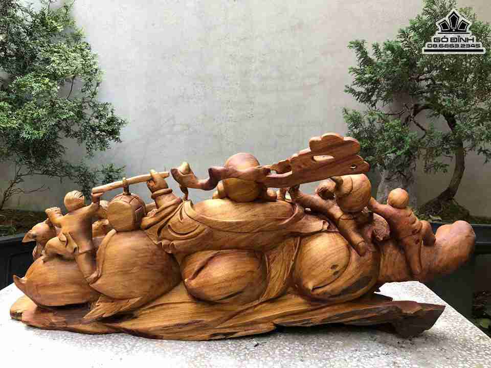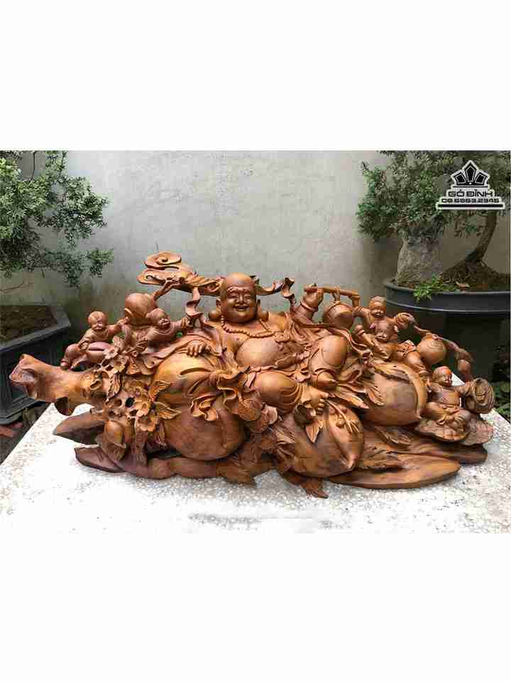 Tượng Phật Di Lặc Ngũ Phúc Ngồi Đào Tiên Gỗ Xá Xị ( Gù Hương ) Cao 43 Ngang 105 Sâu 36 (cm)