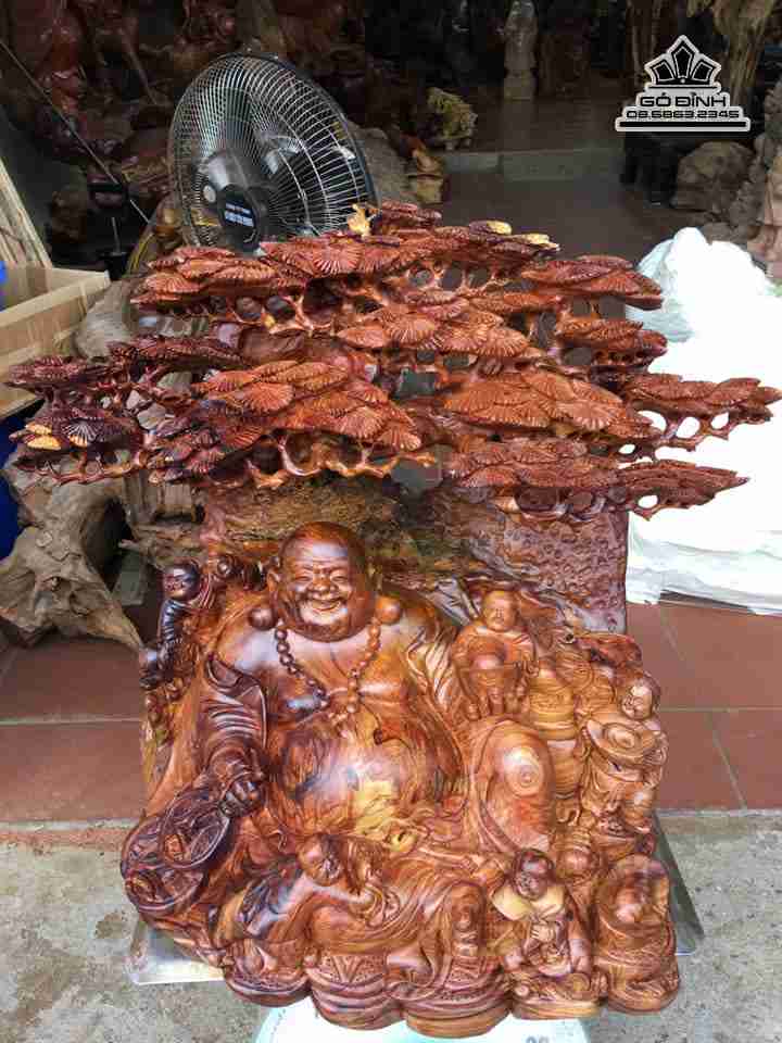 Tượng Phật Di Lặc ngũ phúc ngồi gốc tùng gỗ Cẩm