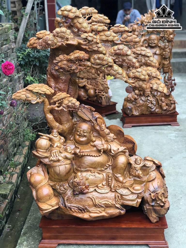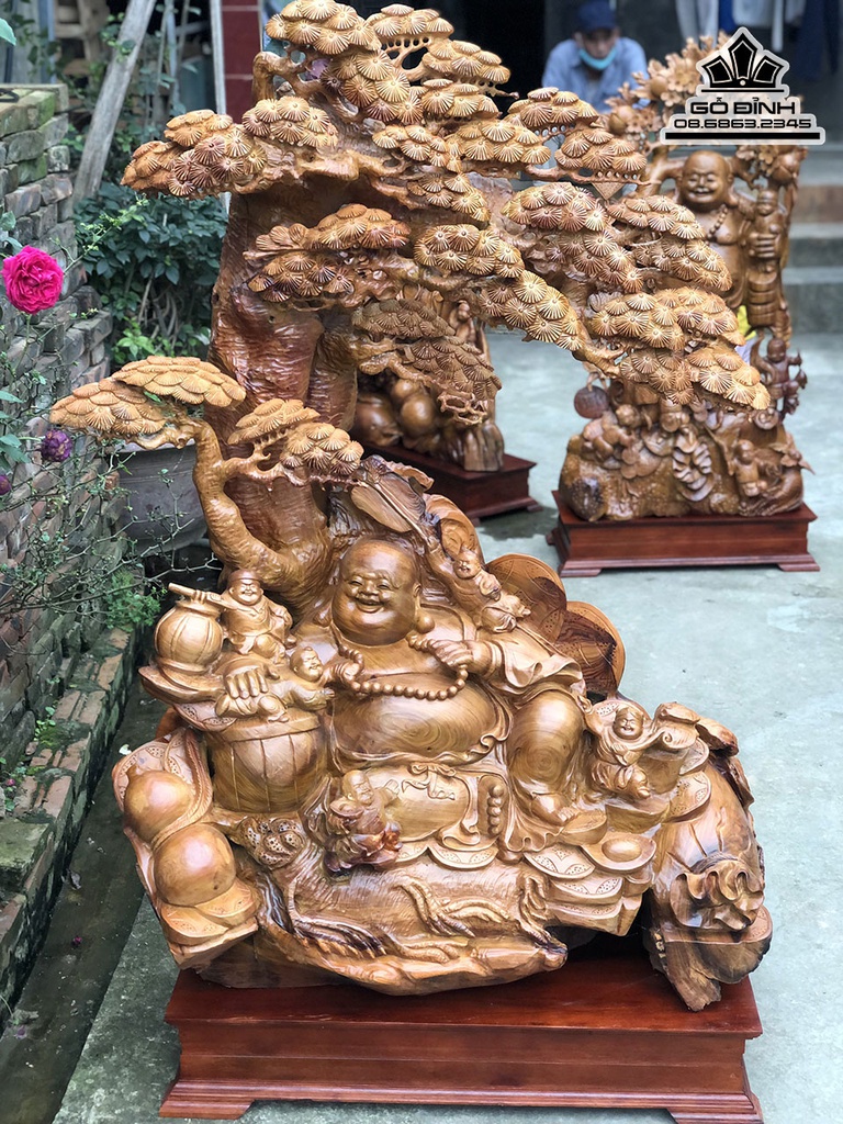 Tượng Phật Di Lặc Ngũ Phúc Ngồi Gốc Tùng Gỗ Hương Cao 145 Ngang100 Sâu 50 (cm)