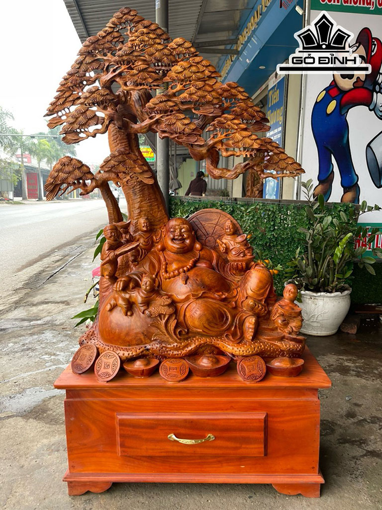 Tượng Phật Di Lặc Ngũ Phúc Ngự Gốc Tùng Gỗ Hương Cao 143 Ngang 80 Sâu 38 (cm)
