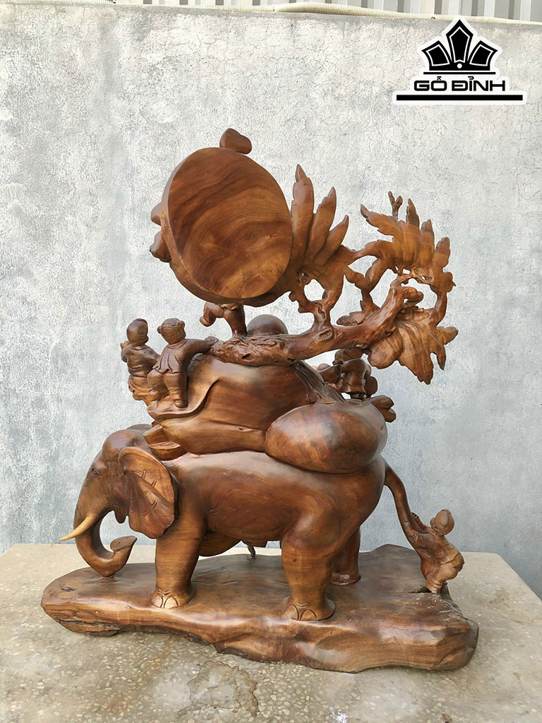 Tượng Phật Di Lặc Ngũ Phúc Ngự Voi Gỗ Xá Xị Cao 83 Ngang 78 Sâu 35 (cm)