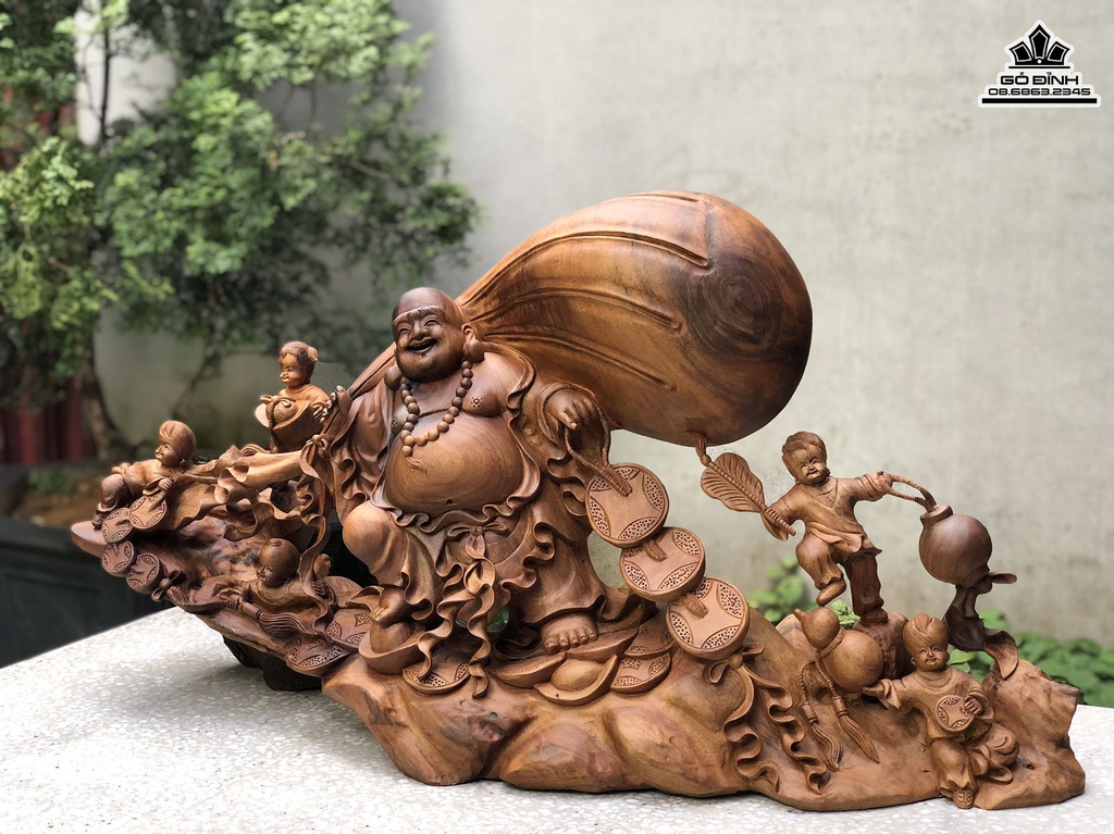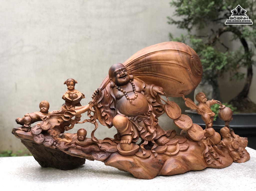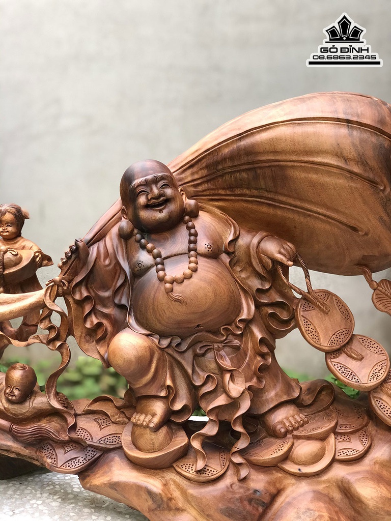 Tượng Phật Di Lặc Ngũ Phúc Vác Bao Tiền Gỗ Bách Xanh Cao 50 Ngang 95 Sâu 26 (cm)