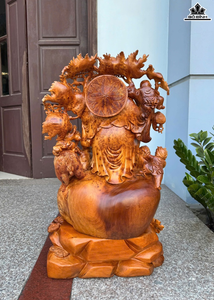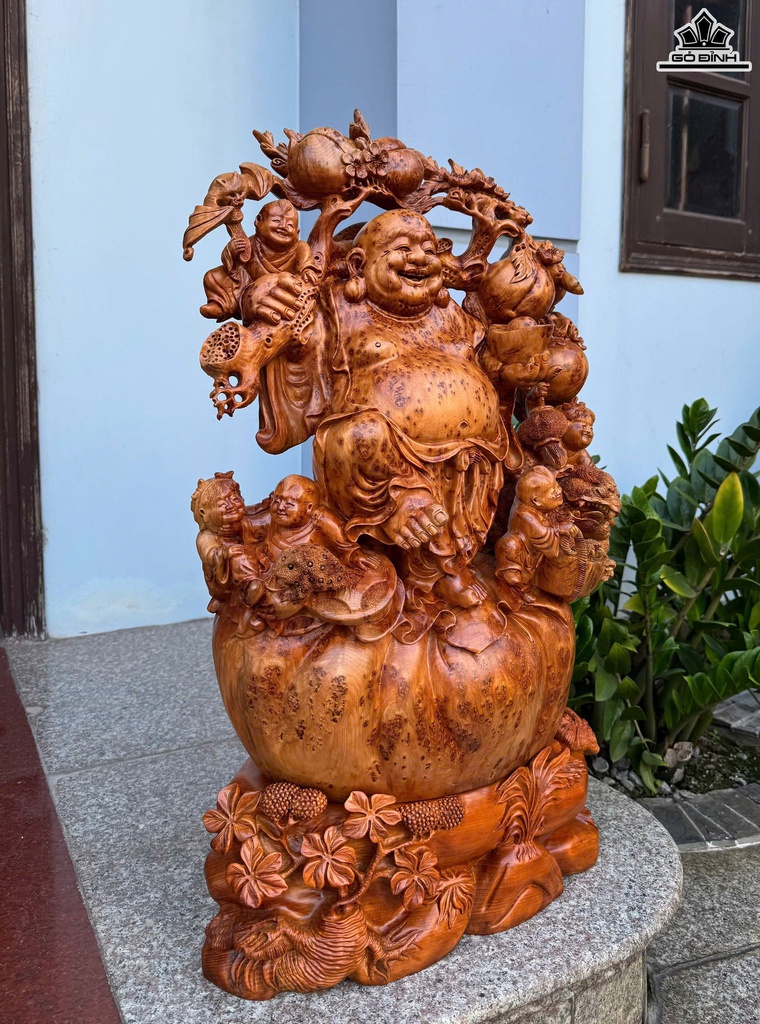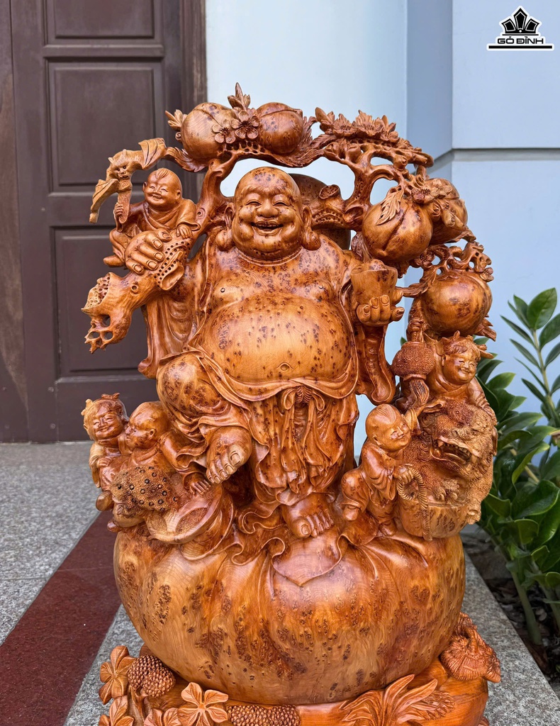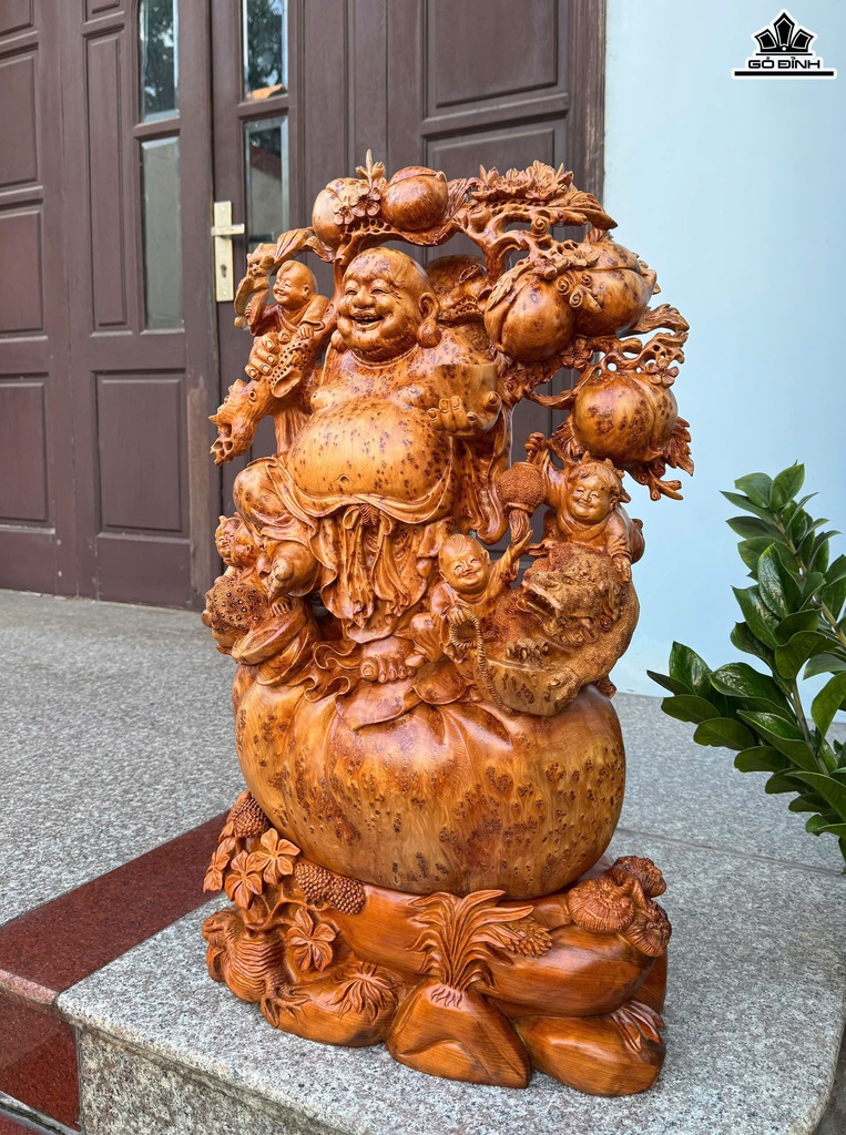 Tượng Phật Di Lặc Ngũ Phúc Vác Đào Gỗ Nu Ngọc Am Cao 76 Ngang 43 Sâu 25 (cm)