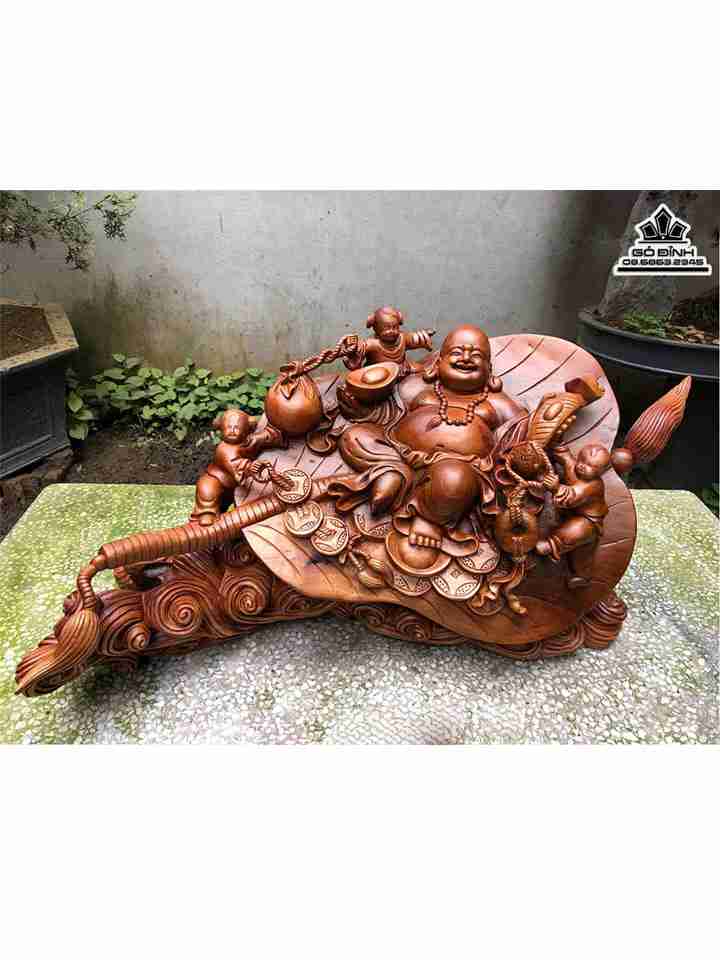 Tượng Phật Di Lặc Ngự Quạt Ba Tiêu Gỗ Xá Xị ( Gù Hương ) Cao 40 Ngang 76 Sâu 30 (cm)