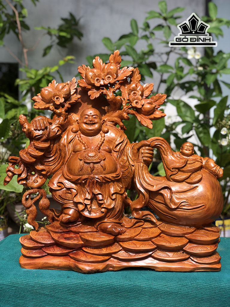 Tượng Phật Di Lặc Nhất Phúc Kéo Bao Tiền Gỗ Hương Cao 62 Ngang 63 Sâu 22 (cm)