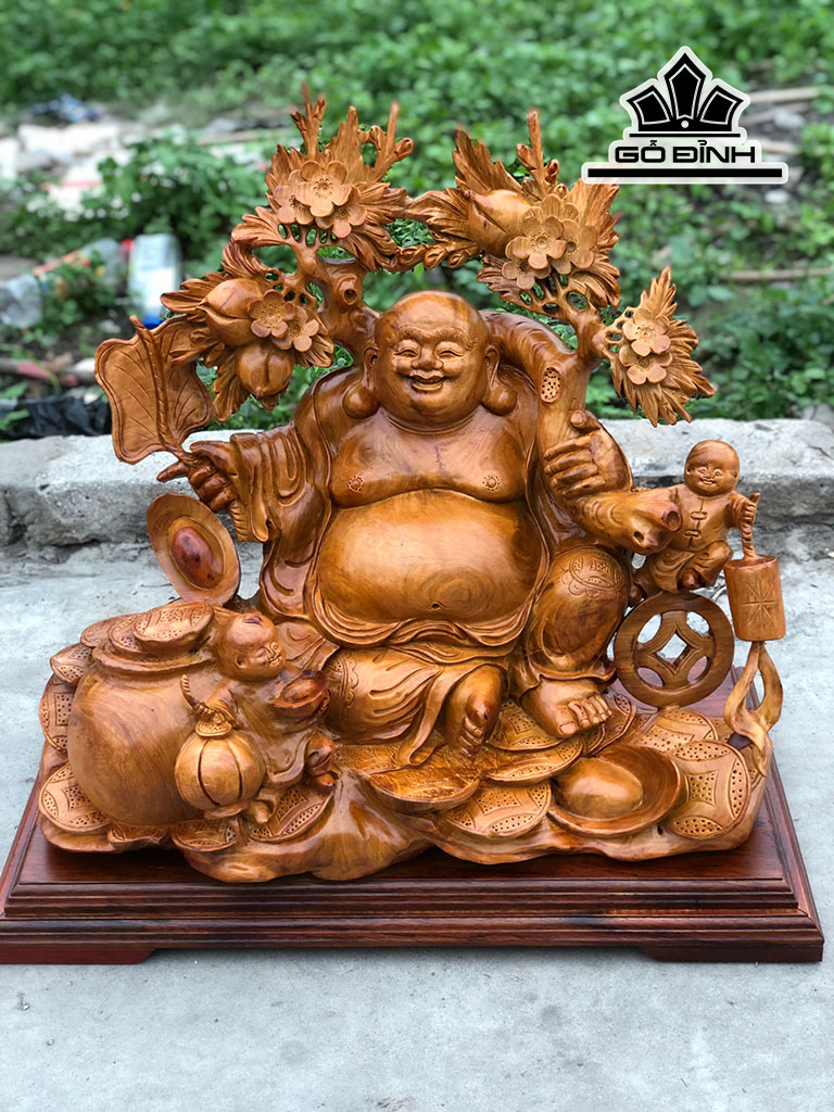 Tượng Phật Di Lặc Nhị Phúc Gỗ Hương Cao 60 Ngang 60 Sâu 30 Kỷ Cao 5 (cm)