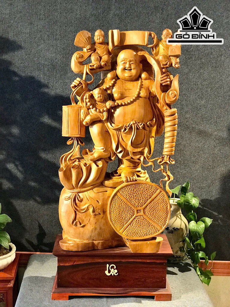 Tượng Phật Di Lặc Tam Phúc Đứng Chum Tiền Gỗ Ngọc Am Cao 113 Ngang 48 Sâu 27 (cm)