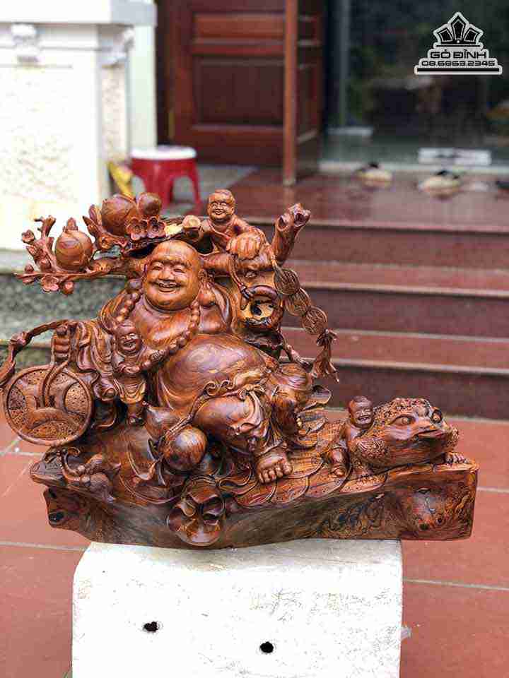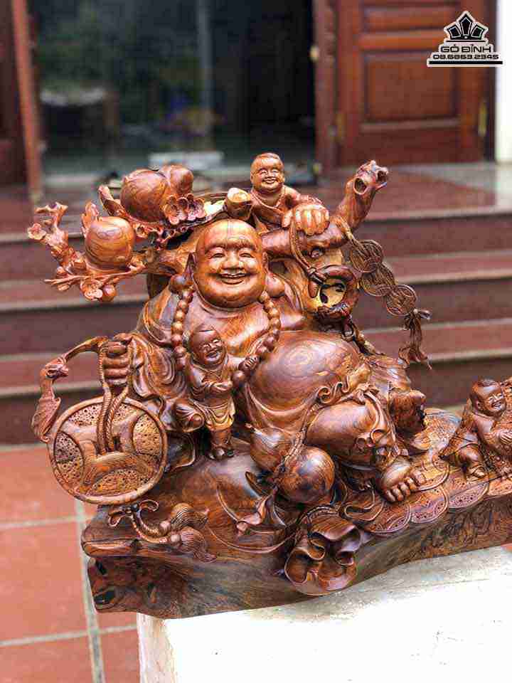 Phật Di Lặc luôn tượng trưng cho niềm vui, may mắn và sung túc được làm bằng gỗ Cẩm là gỗ quý, cứng, thớ gỗ mịn, khá giòn, dễ gia công