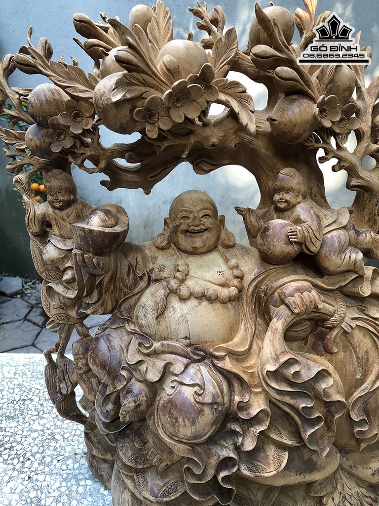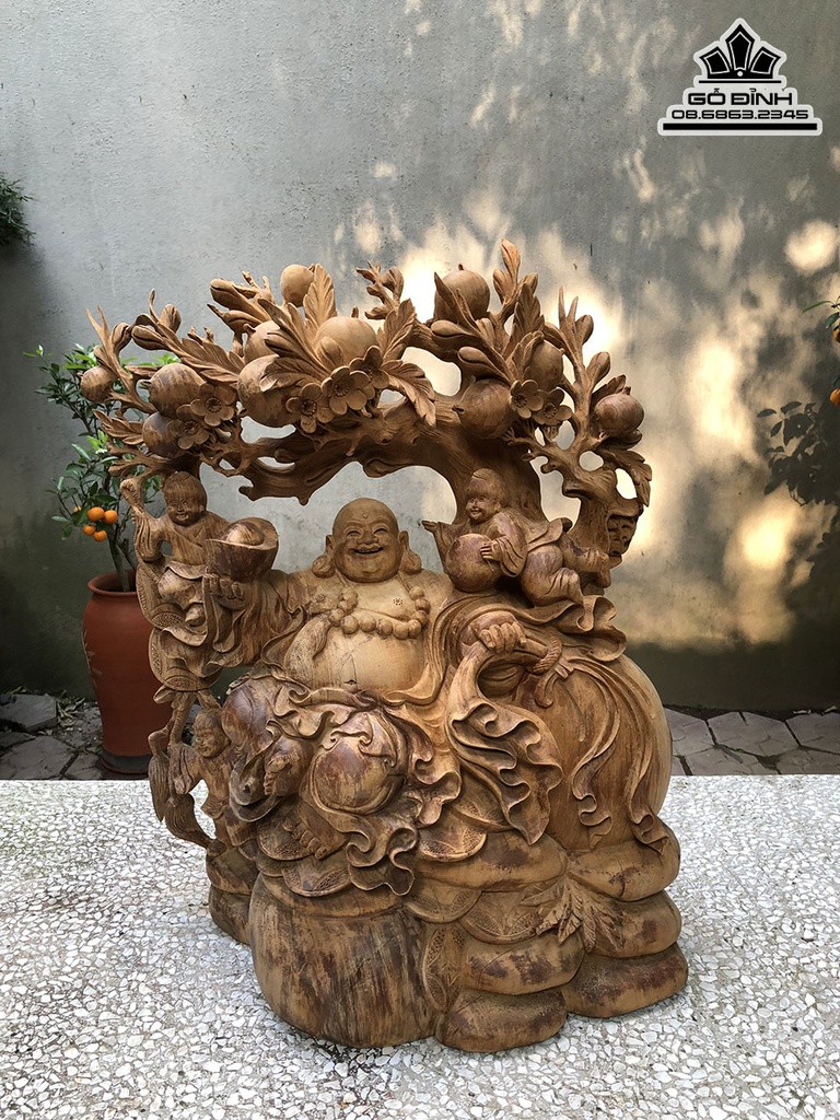 Tượng Phật Di Lặc Tam Phúc Ngồi Gốc Đào Gỗ Ngọc Am