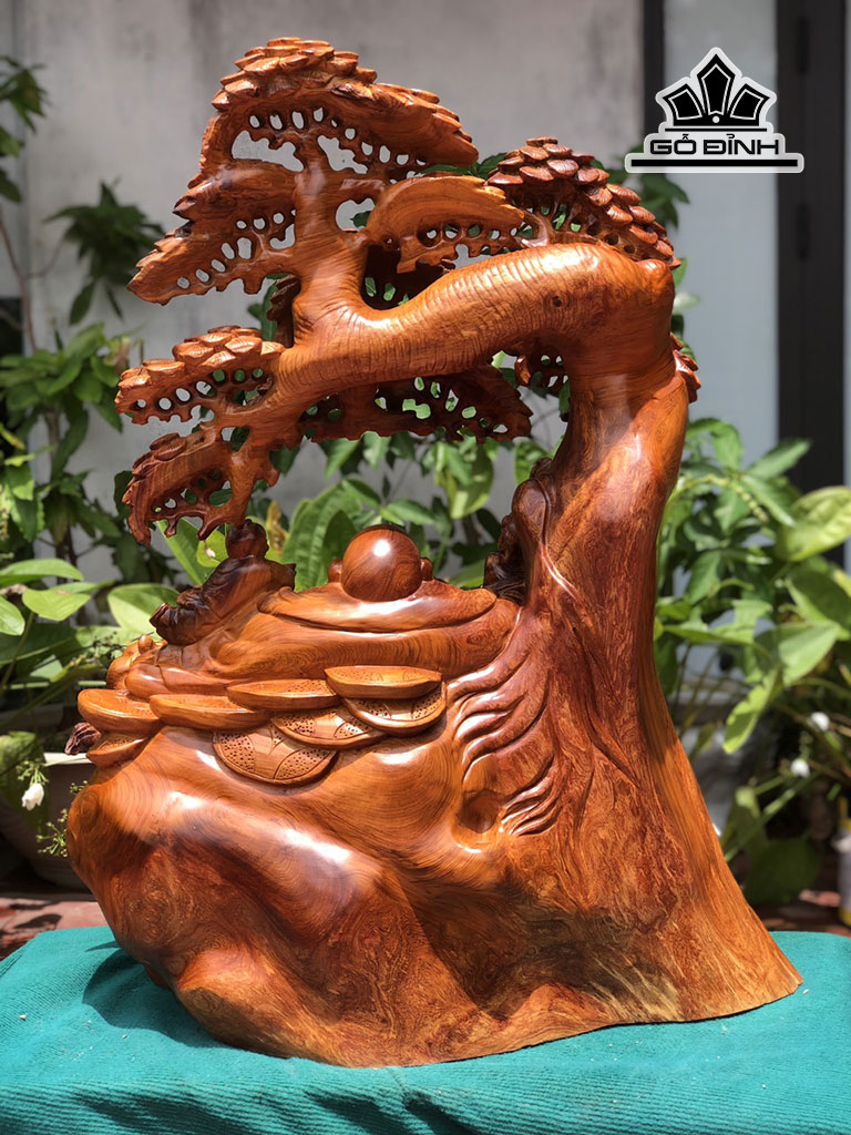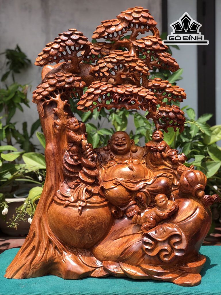 Tượng Phật Di Lặc Tam Phúc Ngự Gốc Tùng Gỗ Hương Cao 91 Ngang 69 Sâu 33 (cm)