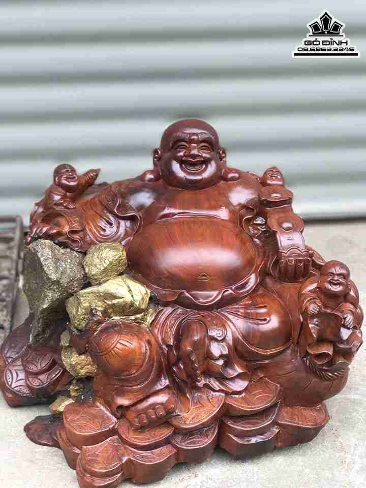Tượng Phật Di Lặc Tam Phúc Ôm Đá Gỗ Hương Cao 45 Ngang 50 Sâu 50 (cm)