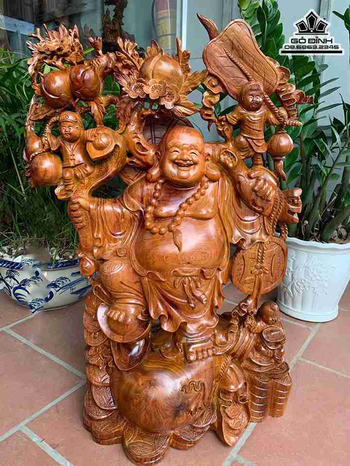 Tượng Phật Di Lặc Tam Phúc Vác Cành Đào Gỗ Hương Cao 83 Ngang 58 Sâu 30 (cm)