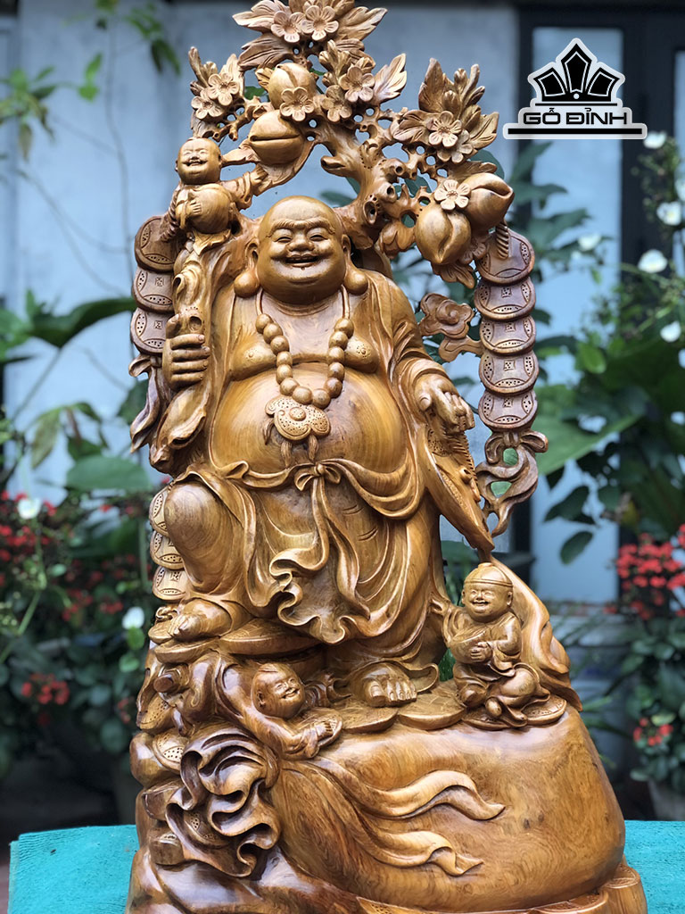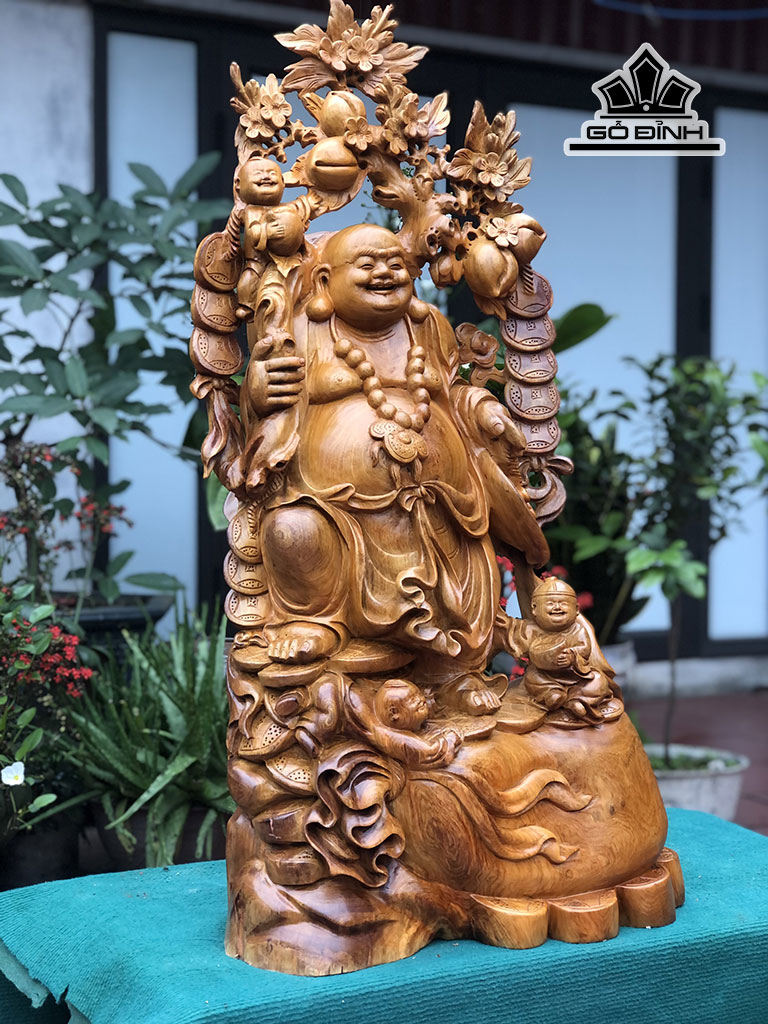 Tượng Phật Di Lặc Tam Phúc Vác Đào Gỗ Hương Cao 93 Ngang 50 Sâu 28 (cm)