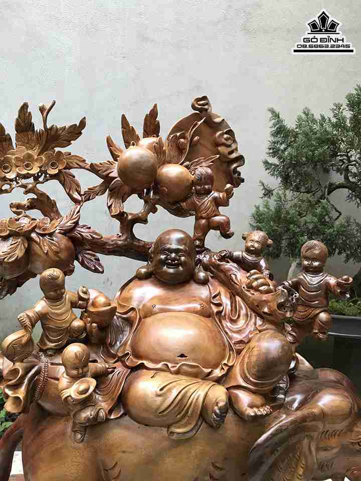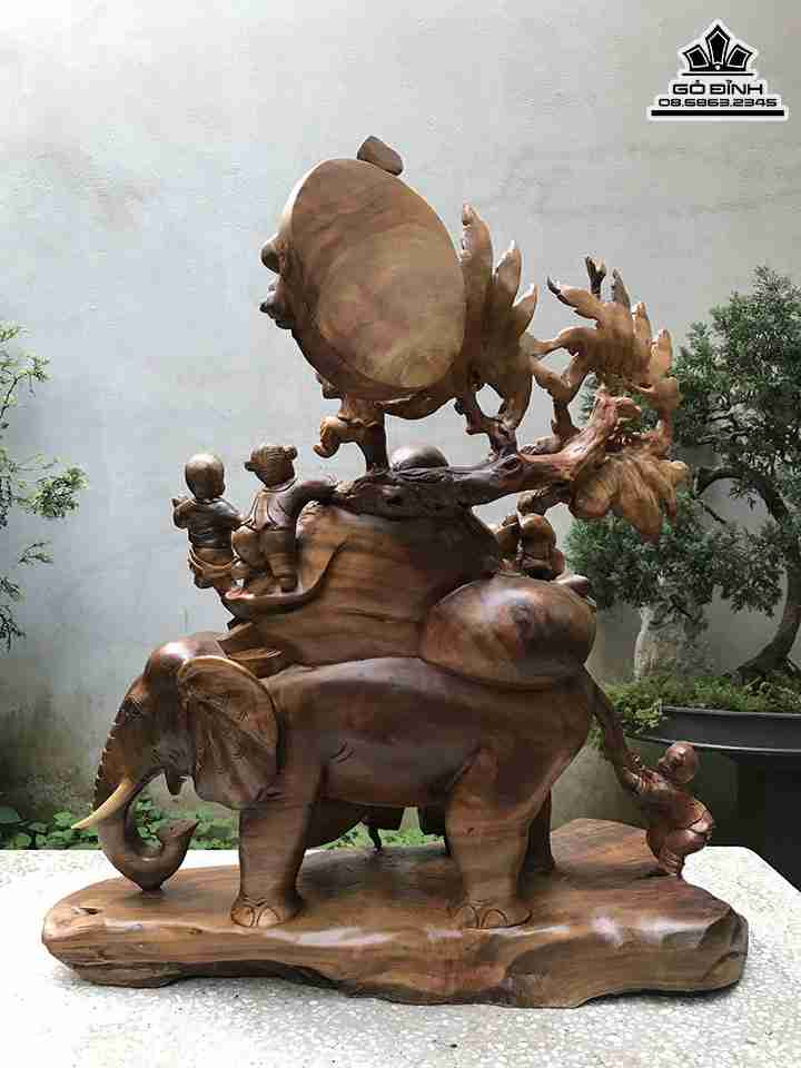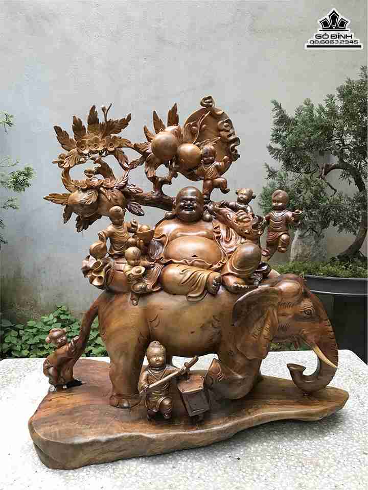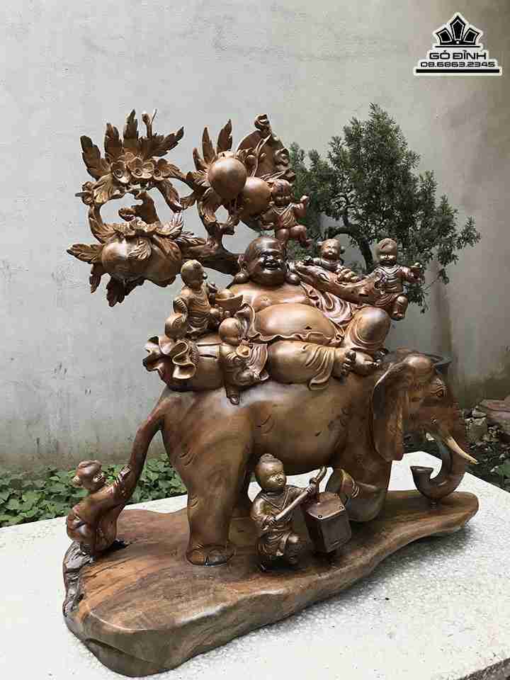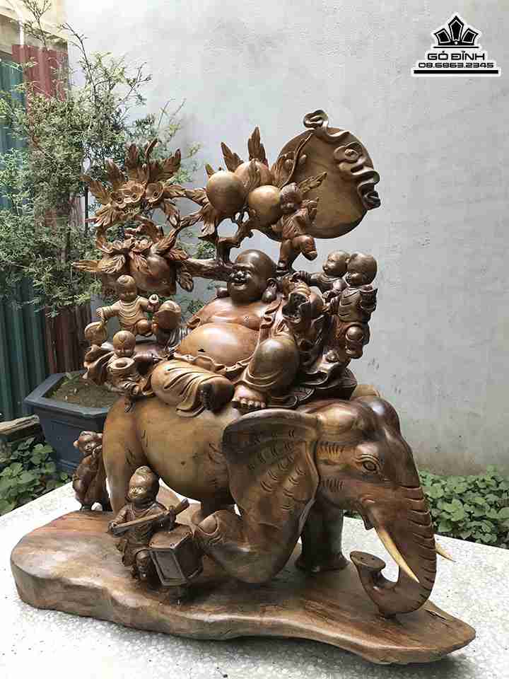Tượng Phật Di lặc Thất Tặc Ngự Voi Gỗ Xá Xị Cao 83 Ngang 80 Sâu 38 (cm)