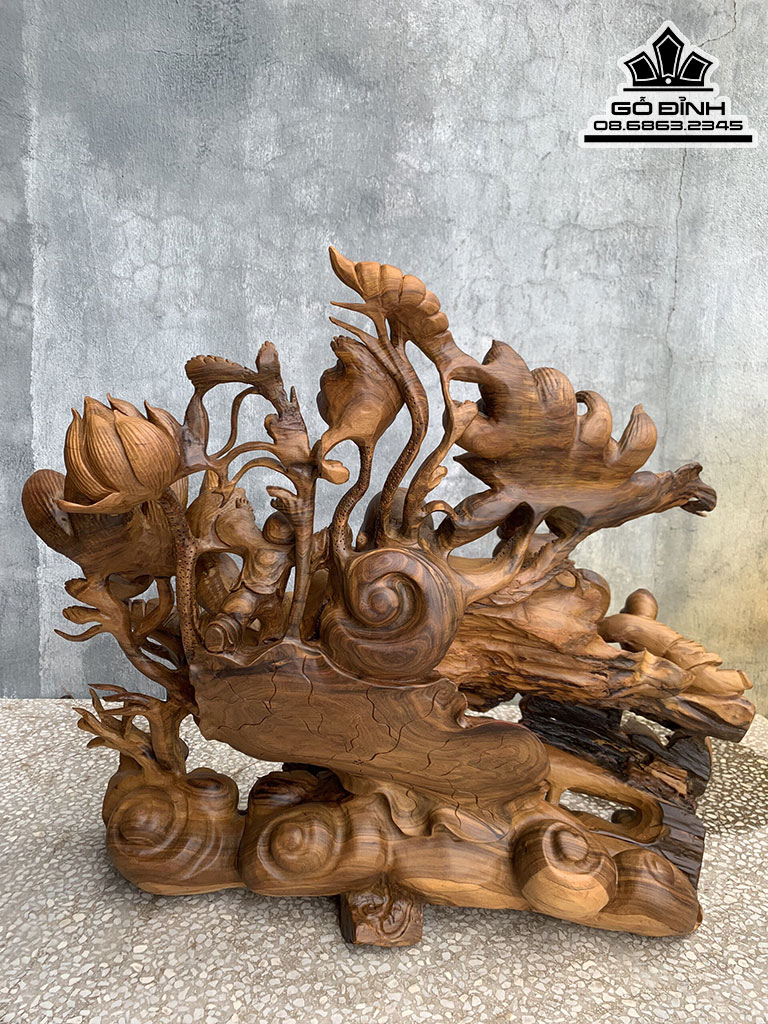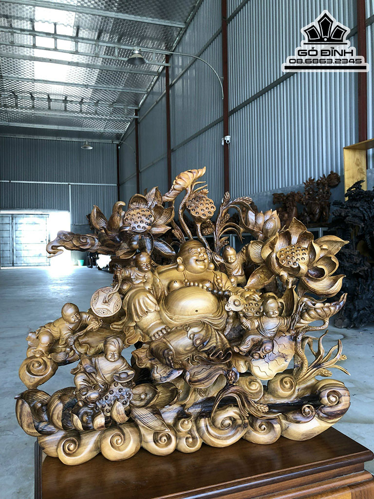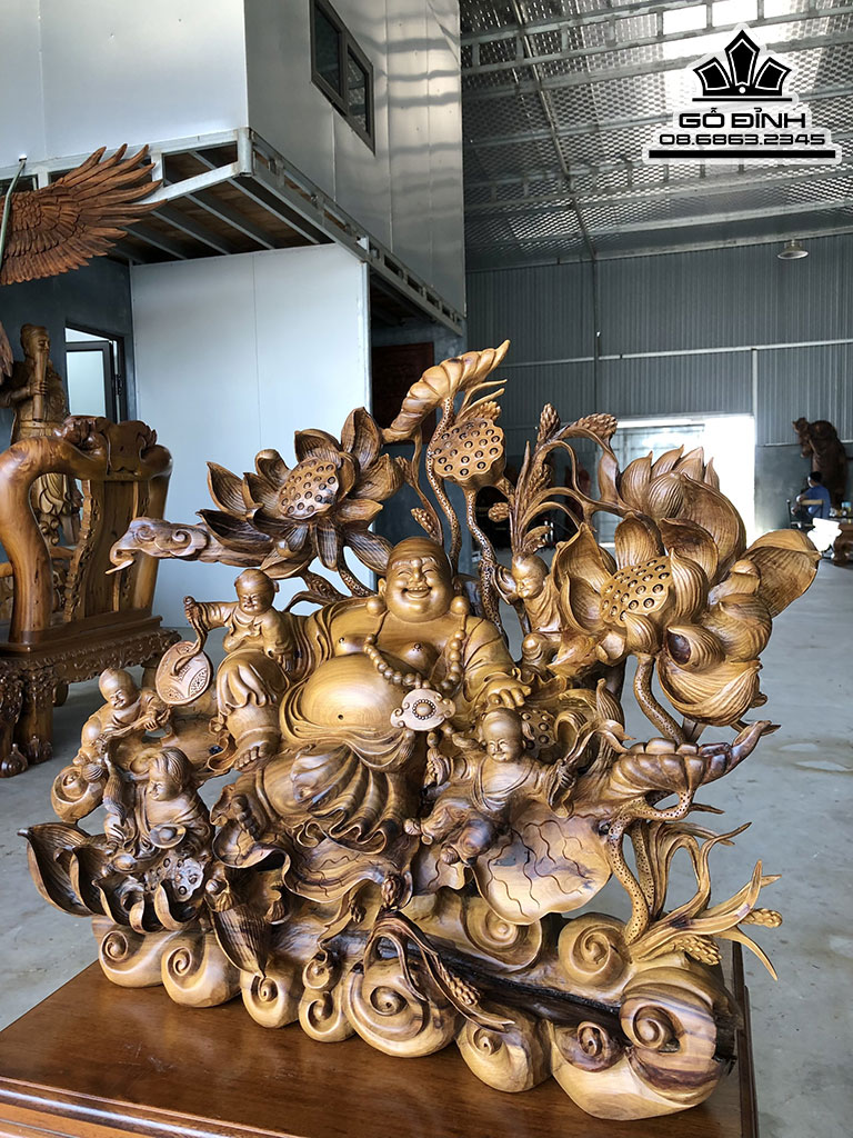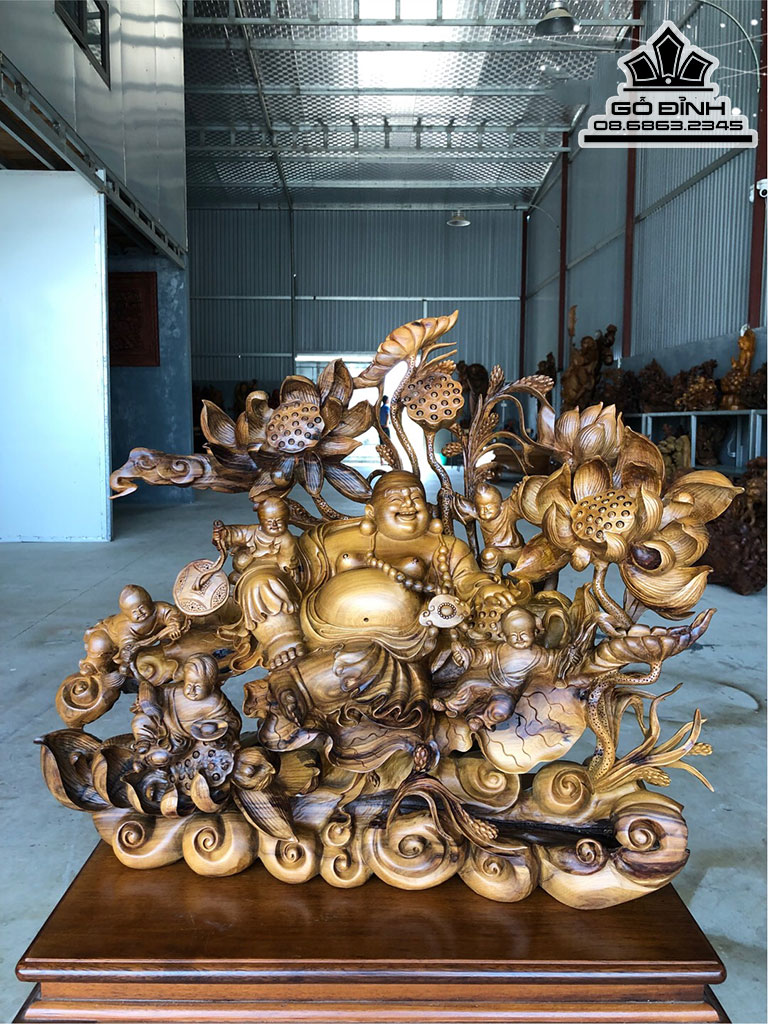 Tượng Phật Di Lặc Tọa Lá Sen Gỗ Bách Xanh Cao 58 Ngang 70 Sâu 28 (cm)