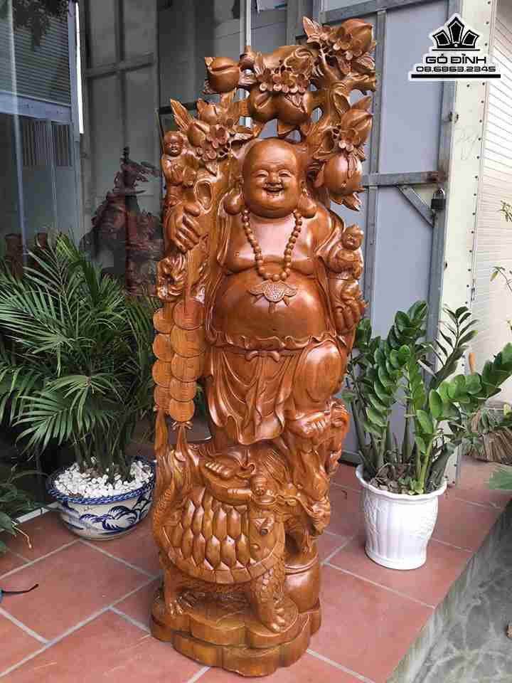 Tượng Phật Di Lặc Đứng Vác Cành Đào Gỗ Xá Xị ( Gù Hương ) Cao 168 Rộng 60 Dày 46 (cm)