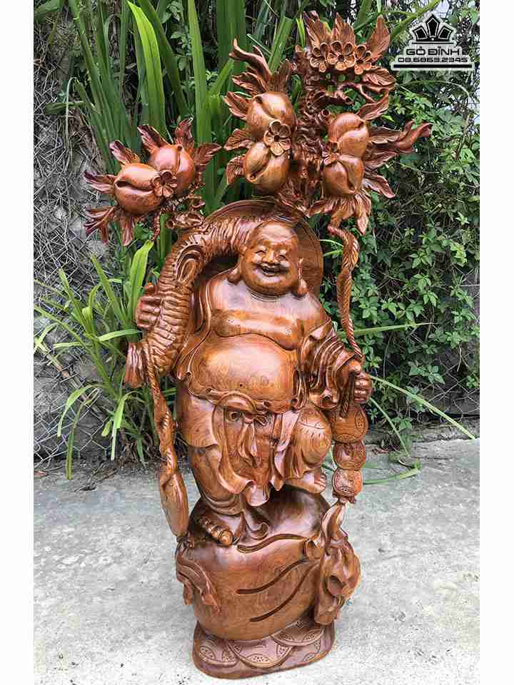 Tượng Phật Di Lặc Vác Cành Đào Gỗ Hương Cao 95 Ngang 50 Sâu 25 (cm)