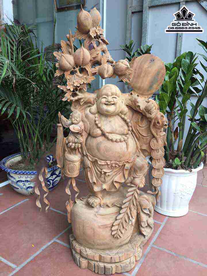 Tượng Phật Di Lặc Vác Cành Đào Gỗ Xá Xị ( Gù Hương ) Cao 103 Rộng 49 Rộng 26 (cm)