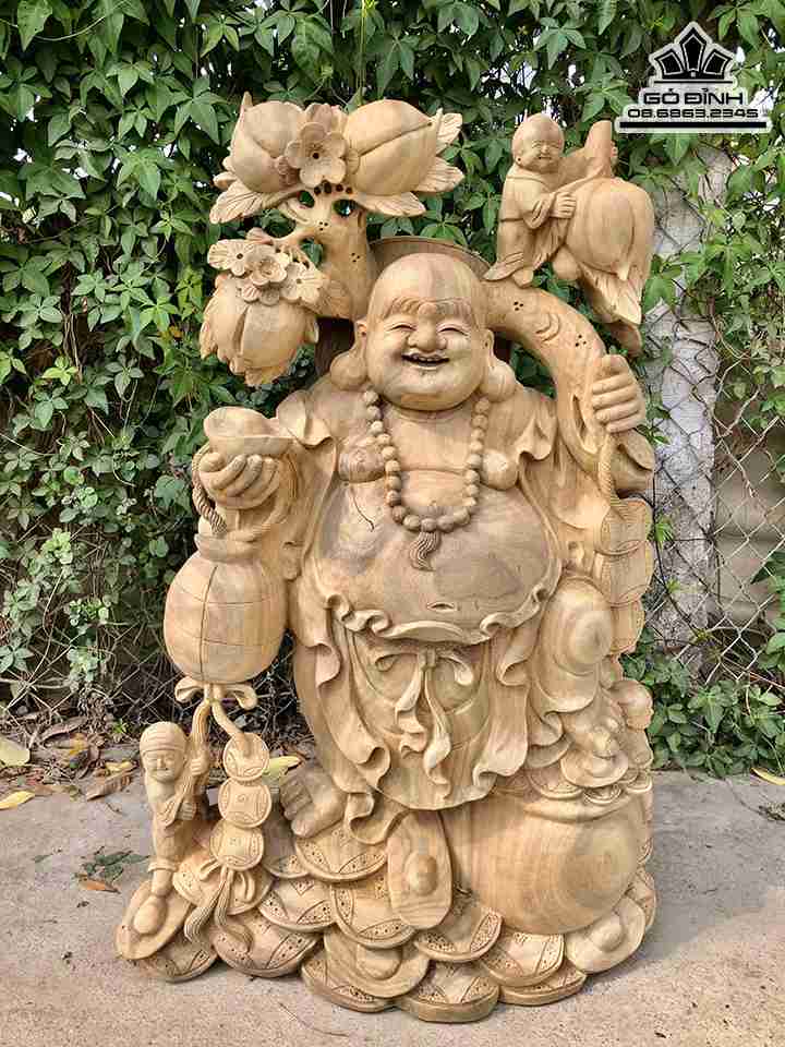 Tượng Phật Di Lặc Vác Cành Đào Gỗ Xá Xị ( Gù Hương ) Cao 87 Rộng 60 Dày 27 (cm)