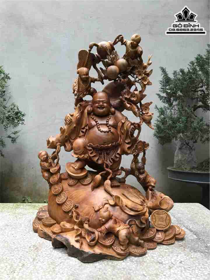 Tượng Phật Di Lặc Vác Cành Đào Gỗ Xá Xị ( Gù Hương ) Cao 80 Rộng 55 Dày 43 (cm)
