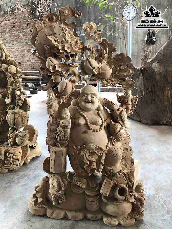 Tượng Phật Di Lặc Vác Cành Đào Gỗ Xá Xị ( Gù Hương ) Cao 115 Ngang 75 Sâu 37 (cm)