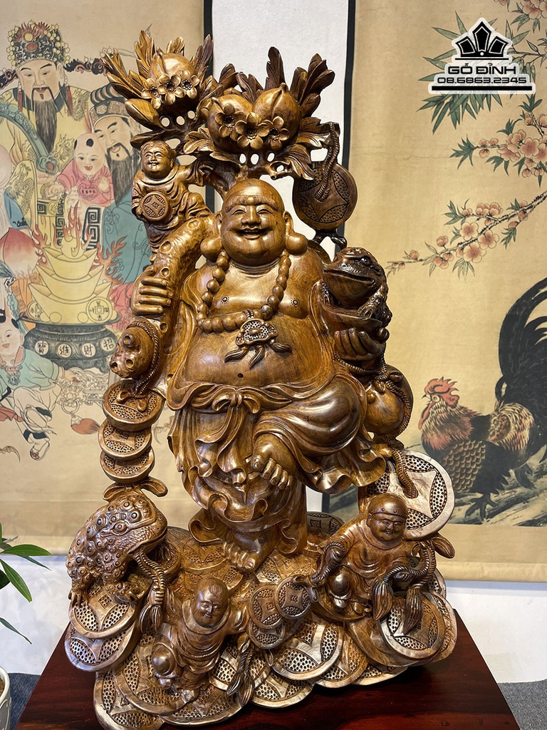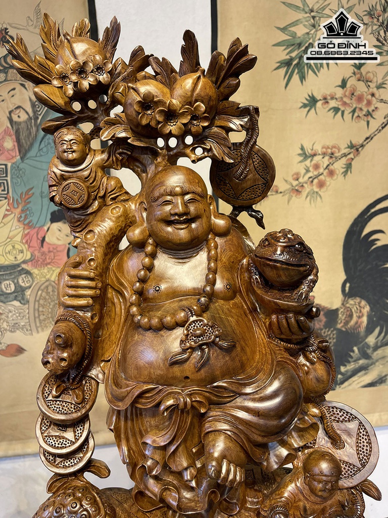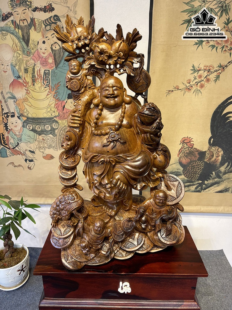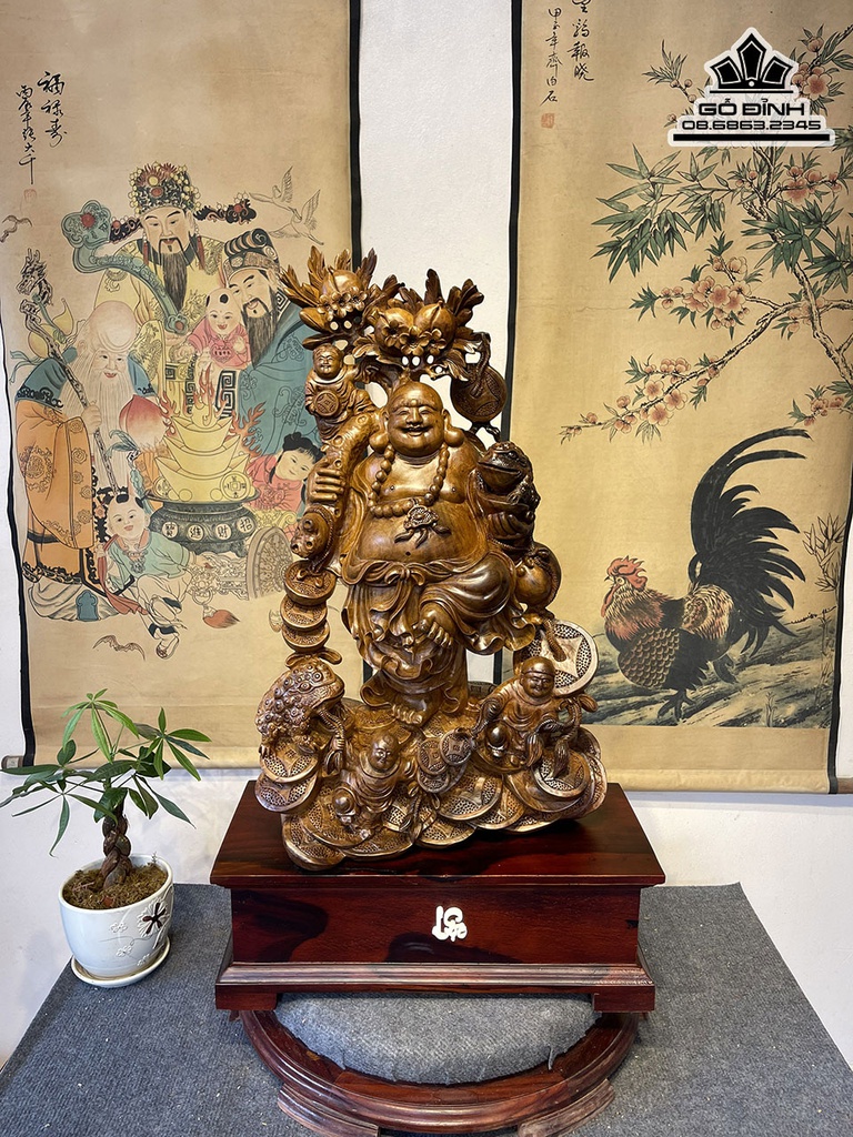 Tượng Phật Di Lặc Vác Cành Đào Gỗ Bách Xanh