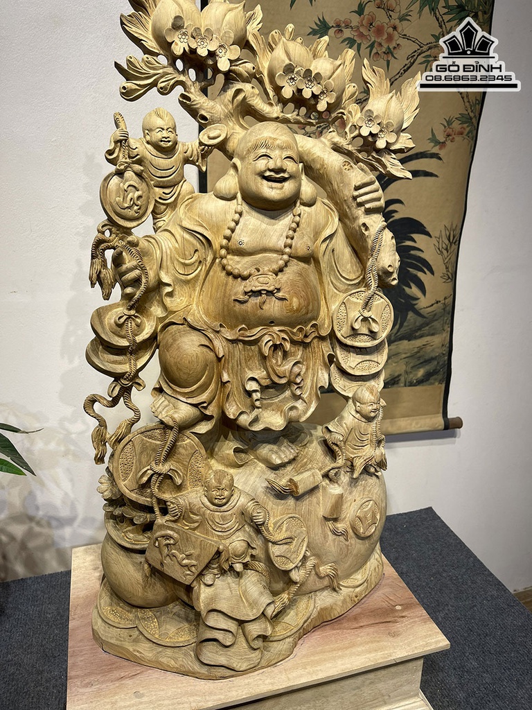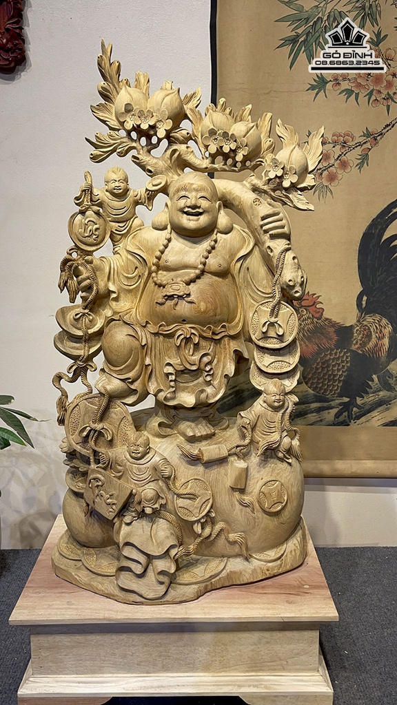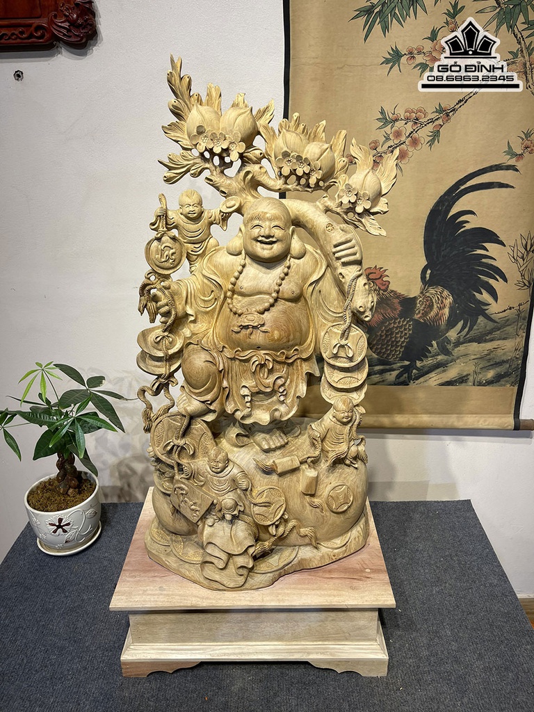 Tượng Phật Di Lặc Vác Cành Đào Gỗ Bách Xanh