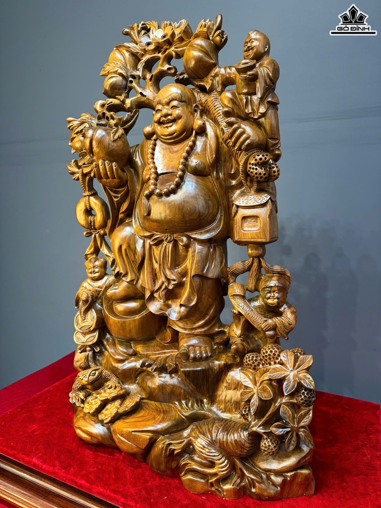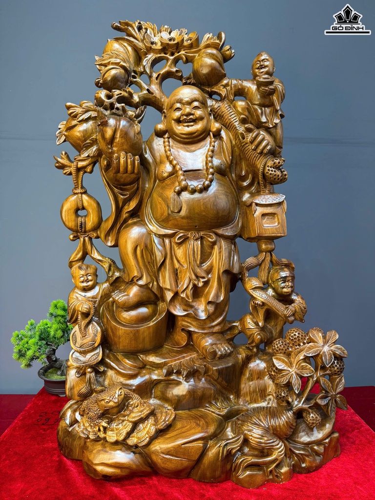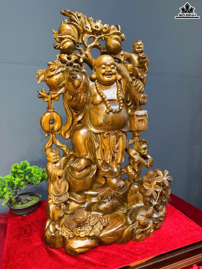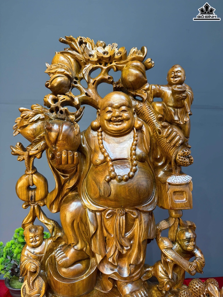 Tượng Phật Di Lặc Vác Cành Đào Gỗ Bách Xanh Cao 80 Ngang 50 Sâu 23 (cm)