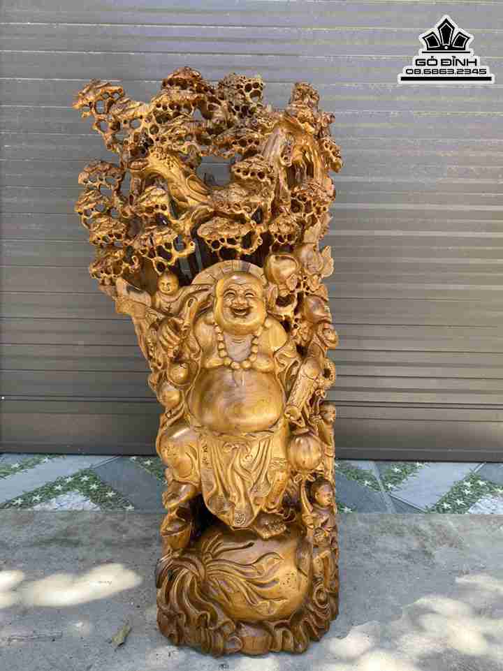 Tượng Phật Di Lặc Vác Cành Đào Gỗ Bách Xanh Cao 99 Ngang 47 Sâu 30 (cm)