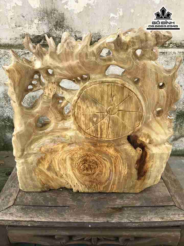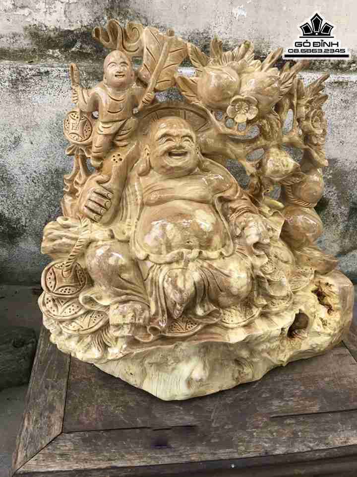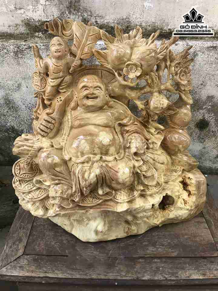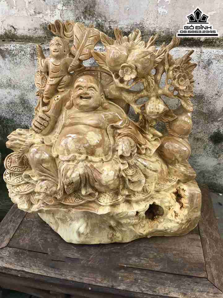 Tượng Phật Di Lặc Vác Cành Đào Gỗ Nu Nghiến Cao 37 Ngang 40 Sâu 20 (cm)