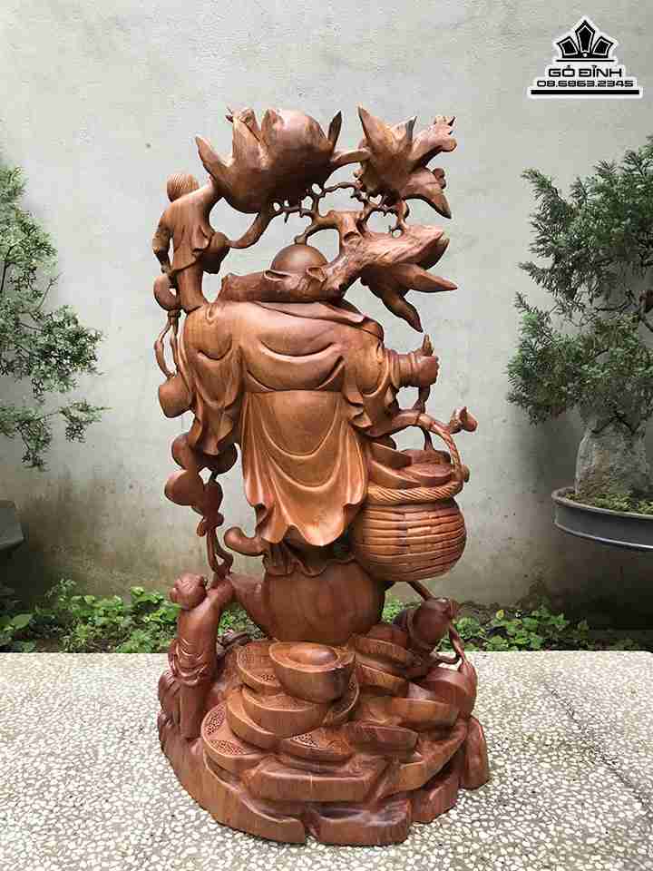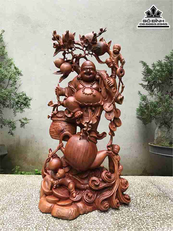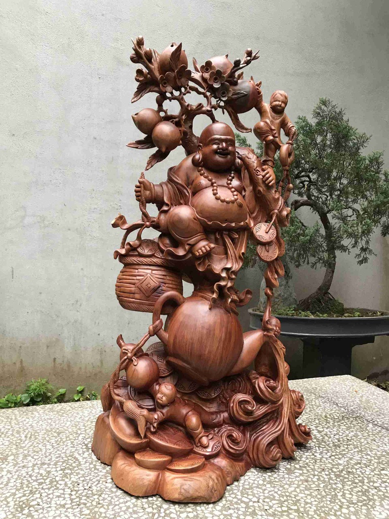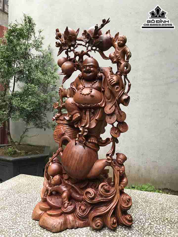 Tượng Phật Di Lặc Vác Cành Đào Gỗ Xá Xị Đỏ