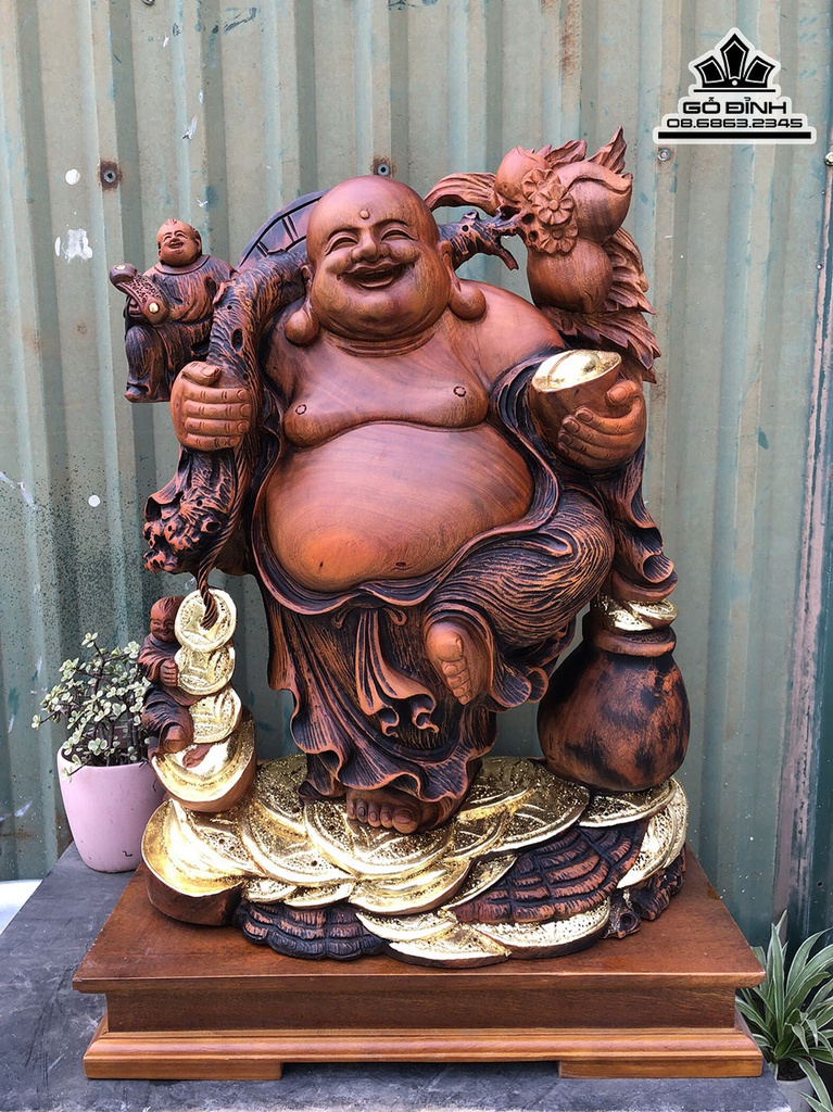 Tương Phật Di Lặc Vác Cành Đào Gỗ Xá Xị (Gù Hương) Cao 63 Ngang 46 Sâu 16 (cm)